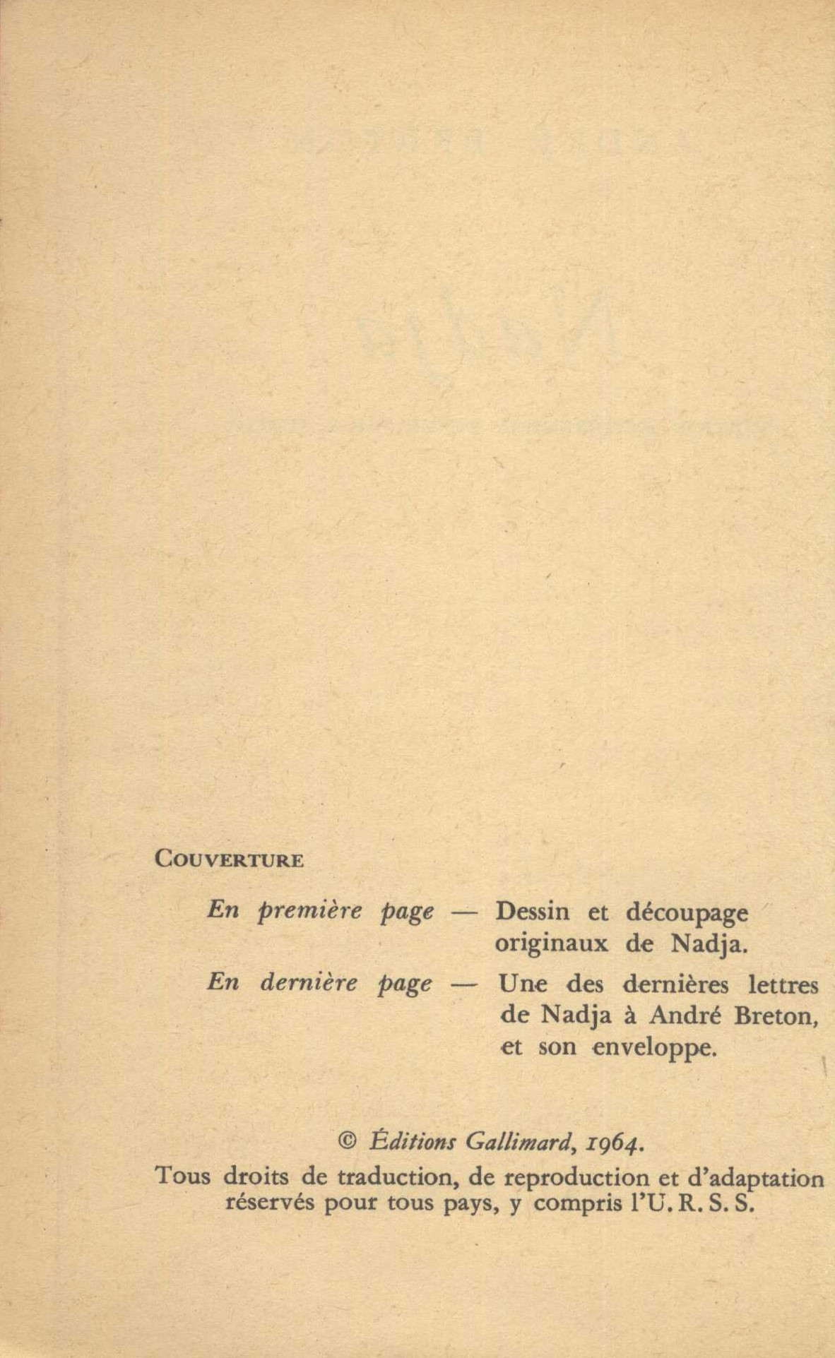 Názvové údaje Nadja / André Breton Osobní jméno Breton, André, 1896-1966 (Autor) Další autoři Gallimard (firma) (Nakladatel, vydavatel) Imprimerie L. Danel (Lille, Francie) (Tiskař) (Tiskař obrazu) Údaje o vydání Édition entièrement revue par l'auteur Nakladatel [Paris] : Gallimard, [1964] Výrobce Loos : Imprimerie Les Petits-Fils Léonard Danel Copyright ©1964 Rozsah 187 stran : ilustrace, reprodukce, fotografie : 17 cm ISBN (Brožováno) Edice Le Livre de Poche, texte intégral ; 1233