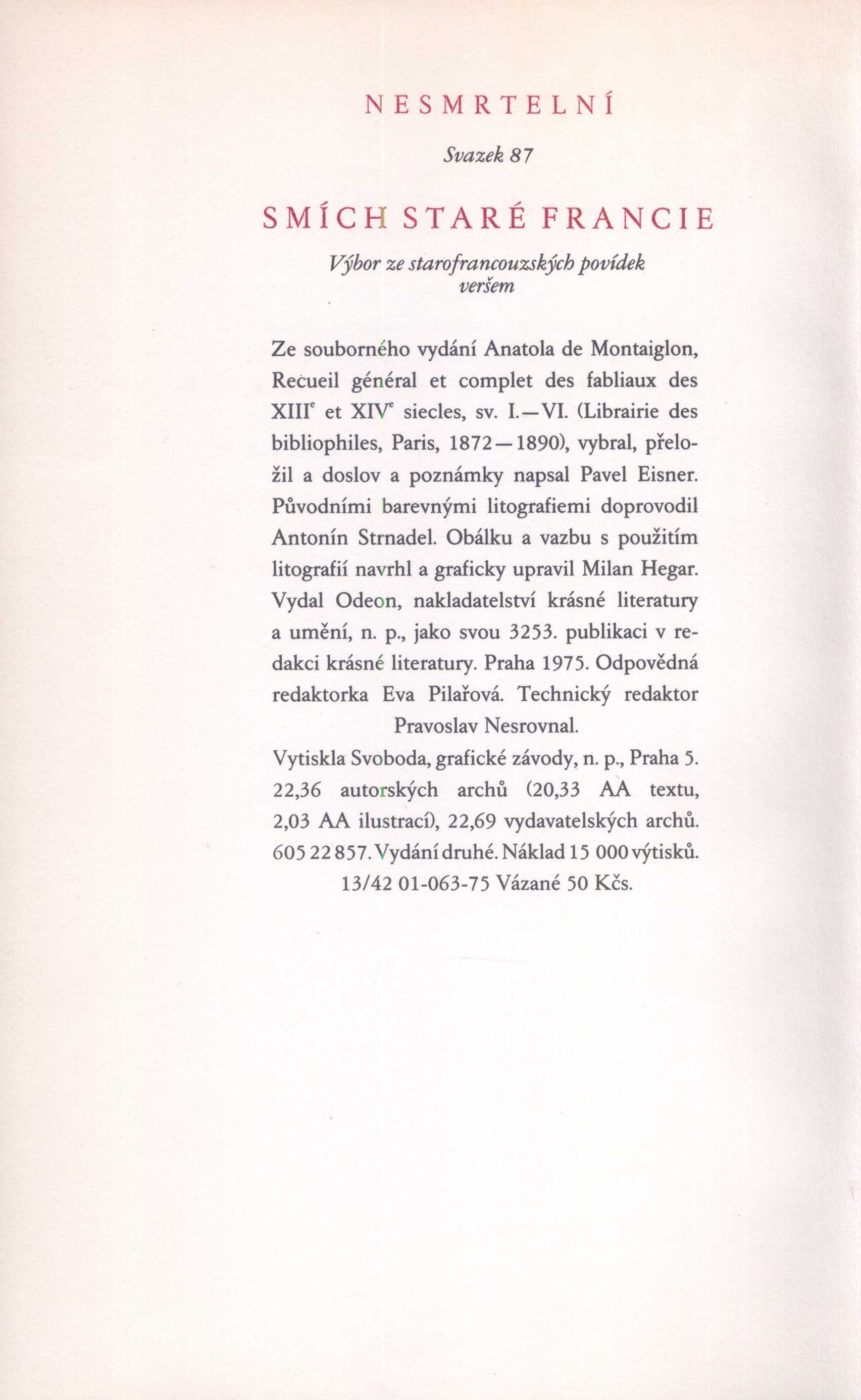 1. Názvové údajeSmích staré Francie : výbor ze starofrancouzských povídek veršem / ze souborného vydání Anatola de Montaiglon, Recueil général et complet des fabliaux des XIIIe et XIVe siecles ... vybral, přeložil, doslov a poznámky napsal Pavel Eisner