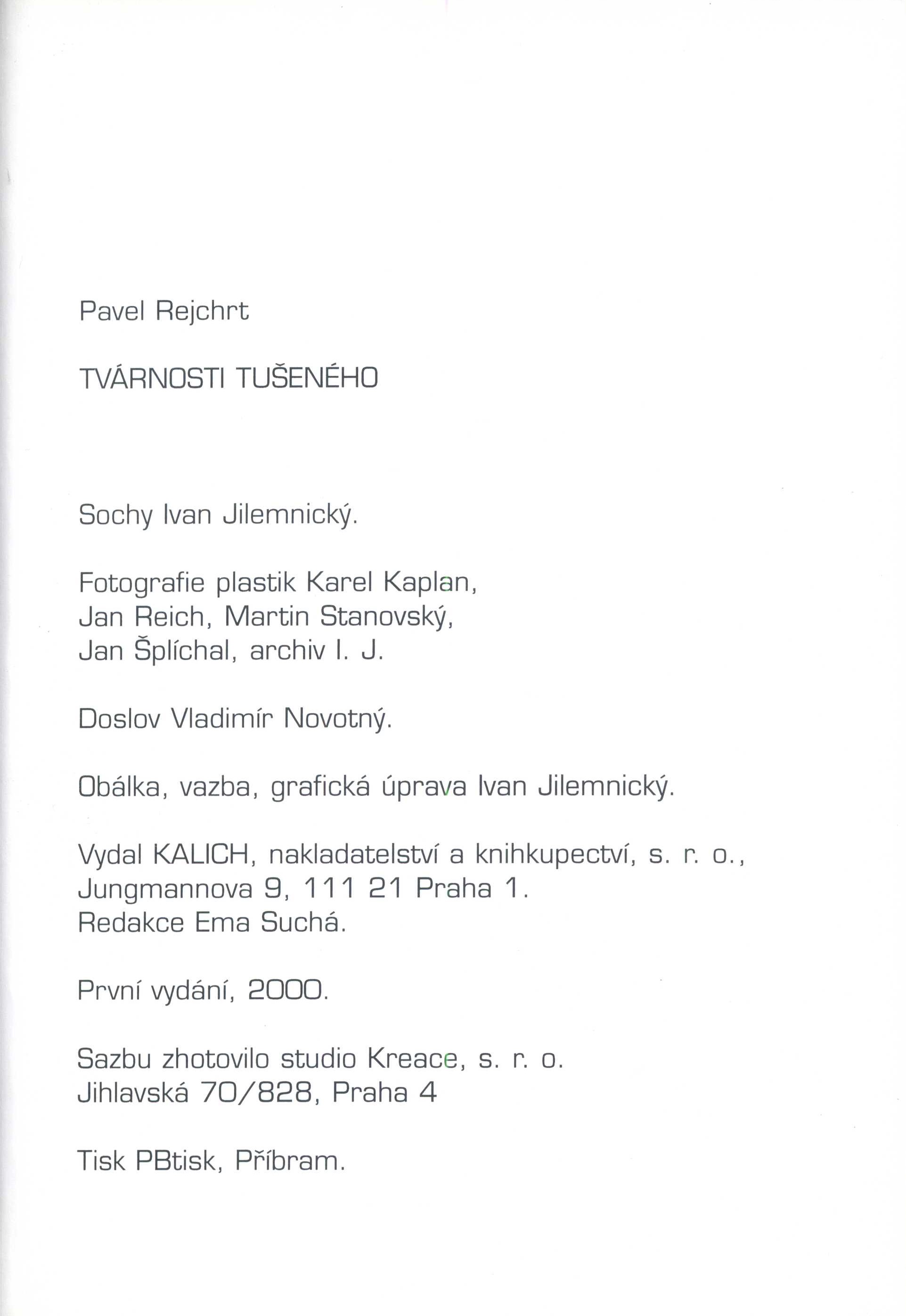 Poznámka o dalších původcích Sazbu zhotovilo studio Kreace, s. r. o. Fotografie plastik Karel Kaplan, Jan Reich, Martin Stanovský, Jan Šplíchal, archiv I. J. Annotation Knížka reflexivních textů českého básníka, prozaika a výtvarníka nabízí jeho osobitý pohled na temnou stránku lidské existence V lyrizujících reflexivních textech uvažuje autor z mnoha pohledů nad lidskou samotou, pomíjejícností a labilitou života. Jejich filozofie je pro vnímavého a stejně naladěného čtenáře impulsem k dalšímu rozjímání za všední hranicí pozemského života. Knihu adekvátně doplňují reprodukce několika soch Ivana Jilemnického Document kind monografie Personal subjects Rejchrt, Pavel, 1942- - malíř a grafik, restaurátor, básník, prozaik, teolog, překladatel * Jilemnický, Ivan, 1944-2012 - sochař, malíř, grafik, pedagog Subject headings moderní sochařství - Česko * české sochařství - 20. stol. * Sculpture, Modern - Czechia - 20th century * Sculpture, Czech Keywords česká literatura * próza * reflexivní próza * Rejchrt P. * výzdoba knihy * sochy * Jilemnický I. * r. 2000 Conspect 821.162.3-3 - Česká próza 73 - Sochařství, keramika, porcelán, umělecké zpracování kovů UDC 821.162.3 * 82-3 * (084.1) * 730 Uživatelské pole PNP Knihovna R&A Hamanových - vázaný výtisk s obálkou. - Fotografií zdobená obálka. - Na přední záložce upoutávka na knihu. - Celoplátěná vazba ve světlé khaki s černou ražbou textu i na hřbetu. - Předsádkové listy v tmavé khaki. - Nakladatelství a značka. - Patitul, na rubu copyright. - Frontispis. - Titulní list. - Obsah. - Celostránkové fotografie zeleně tónované. - Doslov. - Názvy soch. - Poznámka k plastikám. - Tiráž. - Na zadní záložce fota autorů a poznámky o nich. - Fotografií zdobená i zadní strana obálky. Rozsah: 221, [3] s. Rozměr: 24,6 cm. Call number Track No. Location Info R&AHamanovi 1490 0993/2022 Sbírka