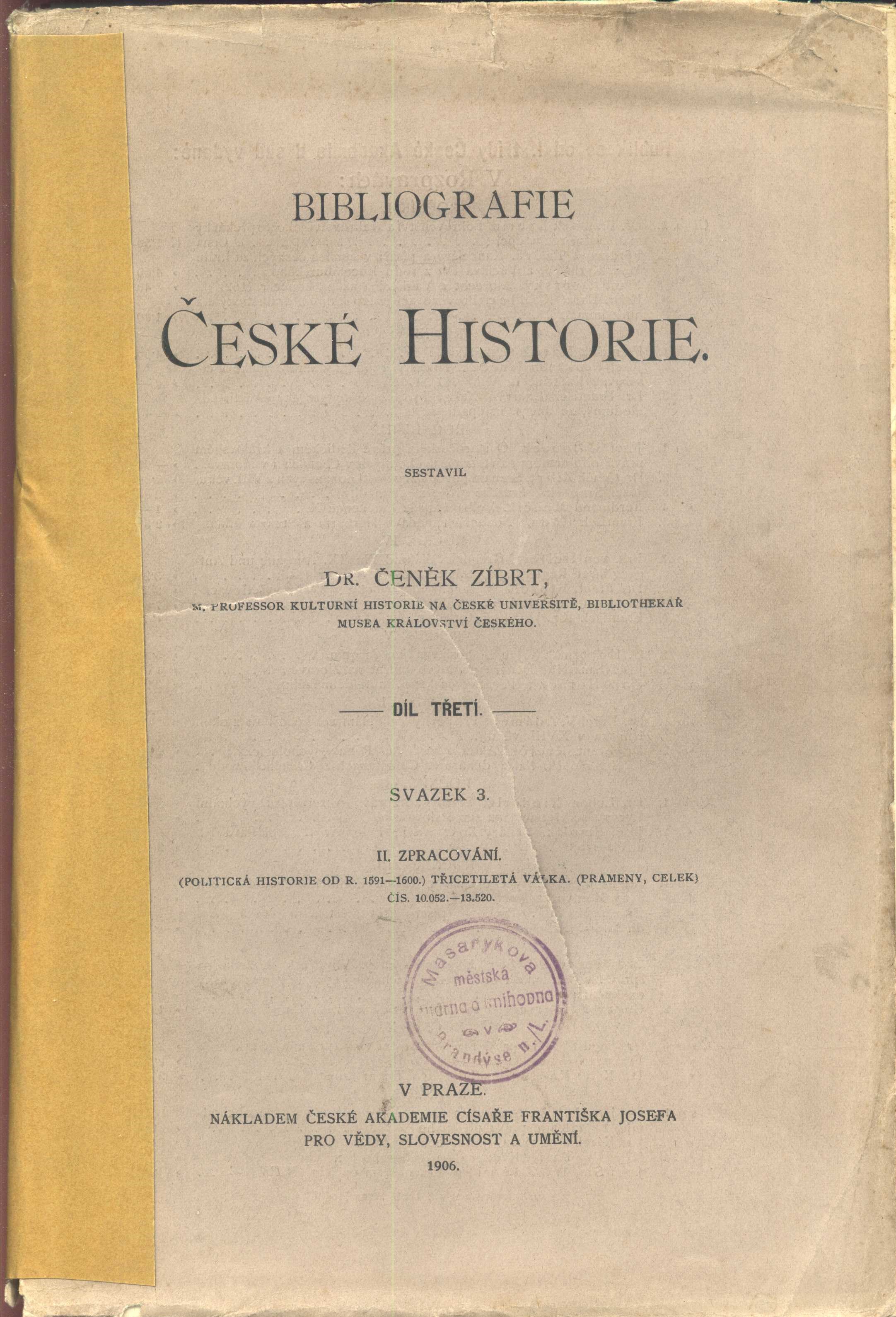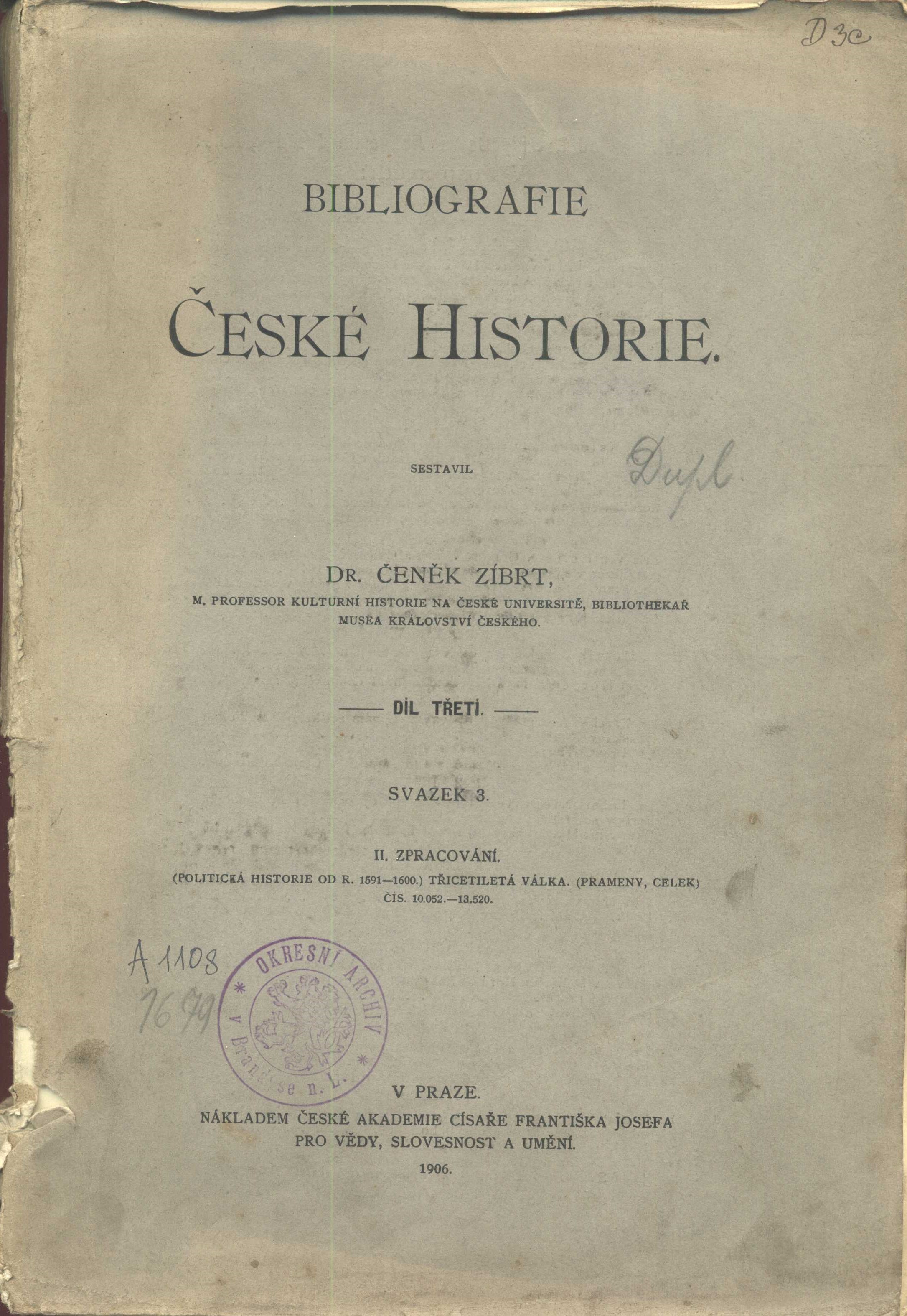 Druh dok. monografie Klíčová slova soupisy * bibliografie * historie * česká historie * stol. 16.-17. * prameny * zpracování * r. 1906 * Zíbrt Č. MDT (01) * (09) * 930.1 Bývalí majitelé Prášek, Justin Václav, 1853-1924 (Dřívější majitel) Uživatelské pole PNP C12c 5590 - typografická obálka. - Od strany 481 do 737. - Živé záhlaví. - Text i cizojazyčný, ve dvou sloupcích. - Poznámky pod čarou. - Za textem titulní list pro celkový třetí díl. - Úvod. - Obsah 3. svazku vložen mezi úvod. - Text i na vnitřních stranách obálky a na zadní straně, opakuje se tiskárna. C12c 5590: obálka zašpiněná, ve hřbetu silně narušená, v kraji mírně zohýbaná, knižní blok oddělen od obálky; částečně volné složky, zašpiněné, nerovné kraje, zohýbané. C12c 5590: na obálce a místy v textu kulaté modré razítko: "Okresní archiv Brandýs n. L.", tužkou a perem čísla a "Dupl"; na rubu obálky nalepen štítek: "C. k. real. gymnasium arcivévody Karla Františka Josefa v Brandýse n. Labem. Knihovna manželů dra. Justina V. Práška a Hermenegildy Práškové-Poncové." Sign. C12c 5591: identické brožované vydání; obálka ve hřbetu slepovaná žlutou páskou, na přední straně obálka protržená, v krajích zohýbaná a místy narušená a zašpiněná, v textu místy barevné podtržení. Sign. C12c 5591: na obálce kulaté modré razítko: "Masarykova městská čítárna a knihovna v Brandýse n./L.", na rubu obálky nalepen štítek: "C. k. real. gymnasium arcivévody Karla Františka Josefa v Brandýse n. Labem. Knihovna manželů dra. Justina V. Práška a Hermenegildy Práškové-Poncové." Rozsah: S. 481-737, iv, vi s. ; Rozměr: 26,8 cm. Signatura Přír.číslo Lokace Info C12c 5590 1166/2022 Sbírka C12c 5591 1167/2022 Sbírka