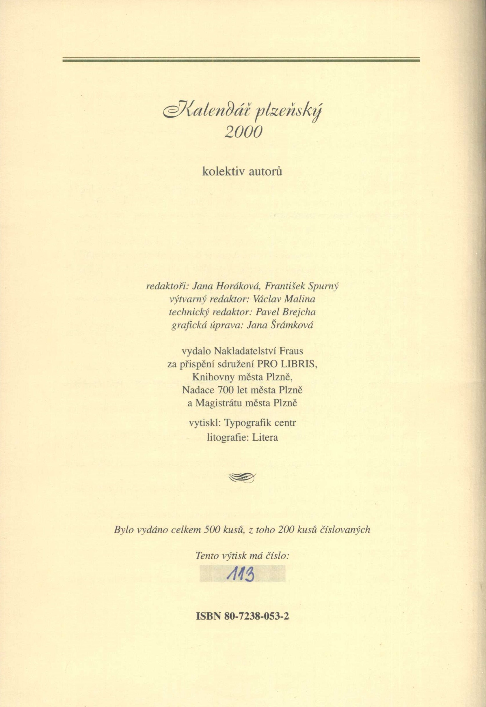 Title information Kalendář plzeňský 2000 : kratochvilné čtení na každý měsíc / kolektiv autorů Další autoři Šrámková, Jana (Book designer) Viktora, Viktor, 1942-2022 (Author of introduction) Kůs, Tomáš, 1950- (Illustrator) Kníže, Roman, 1952- (Author of afterword, colophon, etc.) Corporation Nakladatelství Fraus (Publisher) Pro libris (občanské sdružení, Plzeň) (Publisher) Typografik centr Plzeň (Printer) Publication Plzeň : Nakladatelství Fraus : Pro libris, 2000 Manufacture [Plzeň] : Typografik centr Scope 43 stran : ilustrace ; 21 cm ISBN 80-7238-053-2 (brožováno) Country Czech Republic Language Czech Note Grafická úprava Jana Šrámková