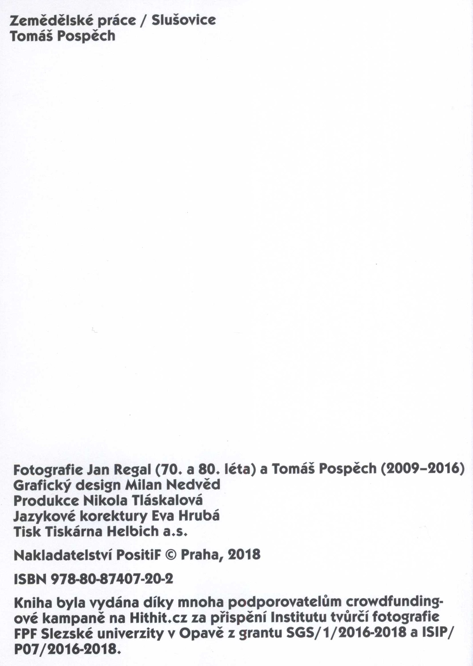 1. Názvové údajeZemědělské práce - Slušovice / Tomáš Pospěch ; fotografie Jan Regal (70. a 80. léta) a Tomáš Pospěch (2009-2016) ; grafický design Milan Nedvěd