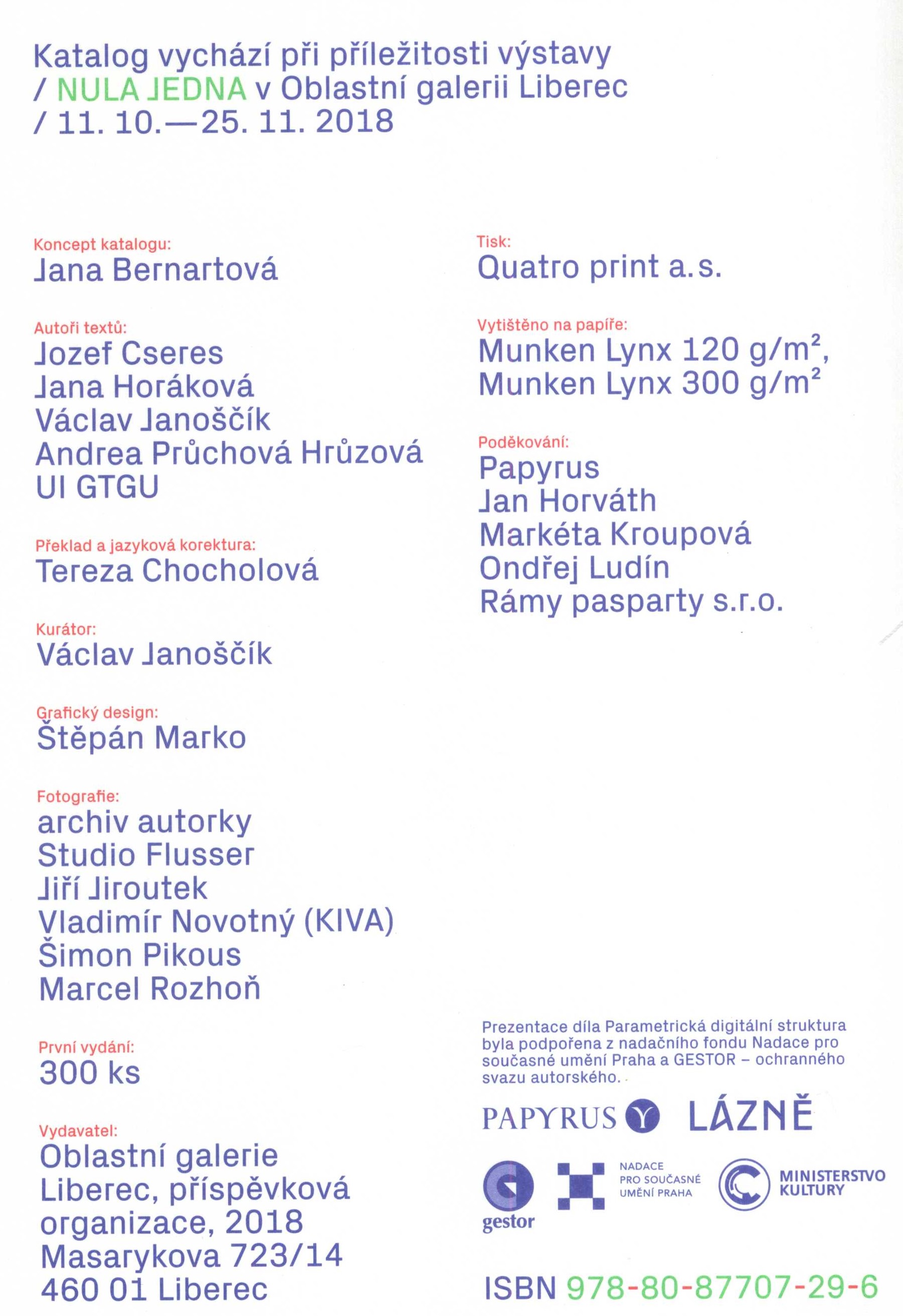 Názvové údaje Nula jedna / Jana Bernartová ; autoři textů: Jozef Cseres, Jana Horáková, Václav Jánoščík, Andrea Průchová Hrůzová ; překlad: Tereza Chocholová ; kurátor: Václav Janoščík ; grafický design: Štěpán Marko Osobní jméno Bernartová, Jana, 1983- (Autor) (Autor koncepce) Další autoři Cseres, Jozef, (Autor) 1961- Horáková, Jana, (Autor) 1971- Janoščík, Václav, (Autor) (Kurátor výstavy) 1985- Průchová Hrůzová, Andrea, (Autor) 1987- Chocholová, Tereza, (Překladatel) 1980- Marko, Štěpán, (Knižní grafik) 1986- Jiroutek, Jiří, (Fotograf) 1967- Novotný, Vladimír Kiva, (Fotograf) 1977- Pikous, Šimon, (Fotograf) 1970- Rozhoň, Marcel, (Fotograf) 1974- Korp. Oblastní galerie (Liberec, Česko) (Nakladatel, vydavatel) QUATRO PRINT, a.s. (tiskárna) (Tiskař) Studio Flusser (foto studio) (Fotograf) Údaje o vydání 1. vydání Nakladatel Liberec : Oblastní galerie, 2018 Výrobce [Brno] : Quatro print a.s. Rozsah 145 nečíslovaných stran : ilustrace ; 23 cm ISBN 97880-87707-29-6 (brožováno) Země vyd. Česko Jazyk dok. čeština * angličtina Poznámky Bílá, barevně graficky zdobená obálka, vícebarevný text; přiznaný šitý hřbet. - Zdobený patitul, zelený a černý text. - Frontispis. - Titulní list s černým textem. - Obsah. - Texty. - Barevné fotografie, diagramy, popis software. - Loga sponzorů v tiráži. - Barevně graficky zdobená zadní strana obálky.