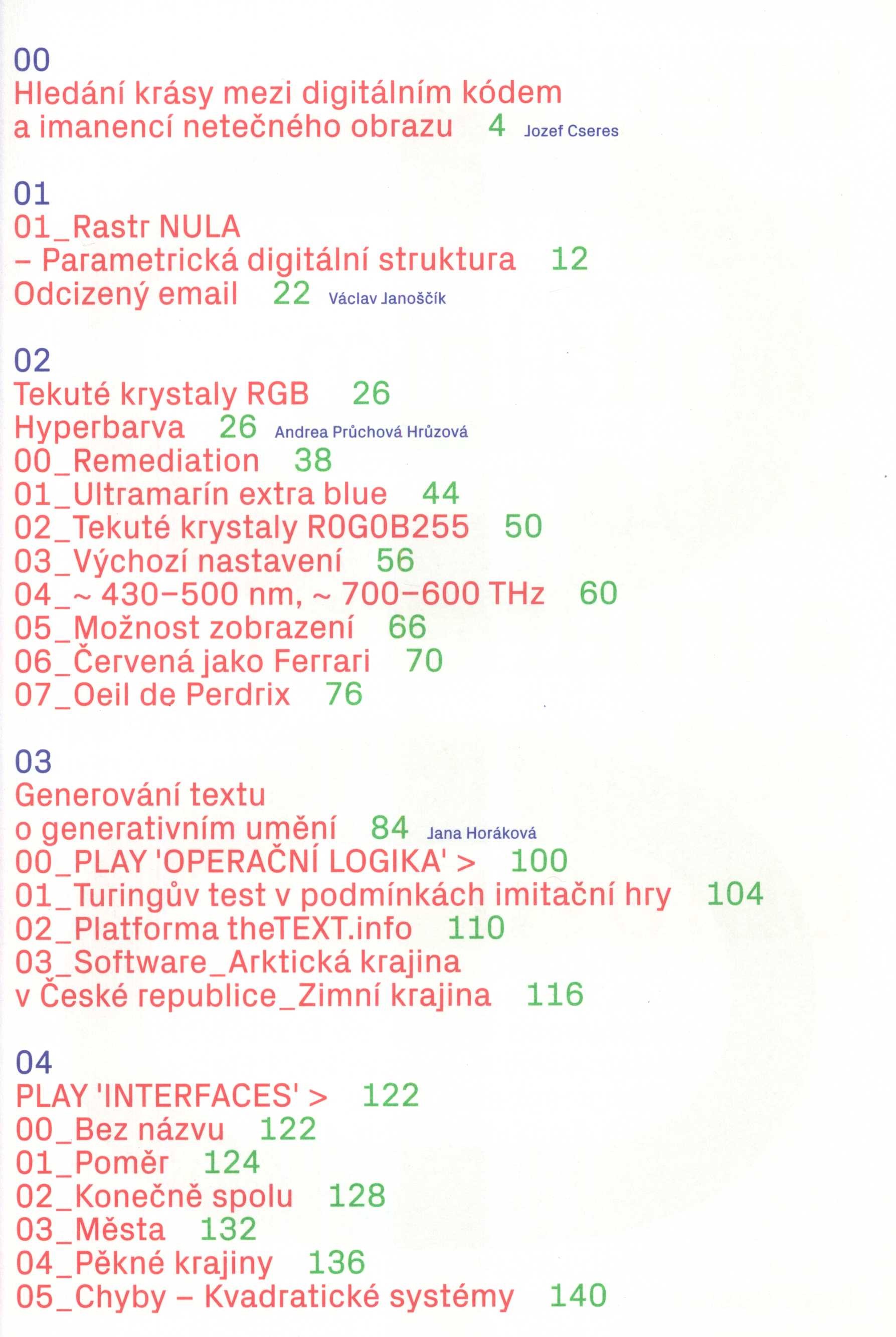 Poznámka o dalších původcích Fotografie: archiv autorky, Studio Flusser, Jiří Jiroutek, Vladimír Novotný (KIVA), Šimon Pikous, Marcel Rozhoň Anotace Na první pohled přemíra červené, zelené a modré. Jakmile se ale ponoříte do této knihy, uvidíte precizně propracovaný systém kategorií a ocitnete se v myslích mediálních umělců. Reprodukovat zkušenost z digitálního média do tištěného je téměř nemožné. Tato kniha odvádí svou práci v tom, že zkoumá několik různých strategií, jak to udělat. Jazyková pozn. Text v češtině, 5 stran v angličtině Druh dok. monografie Osobní hesla Bernartová, Jana, 1983- - výtvarnice, pedagožka, kurátorka Klíčová slova česká literatura * katalog výstavy * výtvarné umění * moderní umění * multimediální umění * digitální umění * počítačové umění * Liberec * Česko * stol. 21. * Nejkrásnější české knihy * r. 2018 MDT 72/76 * (083.824) * 821.162.3 Uživatelské pole PNP Kniha vydána také v anglické mutaci. Katalog byl vydán ke stejnojmenné výstavě, která se uskutečnila v Oblastní galerii v Liberci od 11.10. do 25.11.2018. Nejkrásnější české knihy 2018 - 3. místo Katalogy. Signatura Přír.číslo Lokace Info NK/18 028 1515/2022 Sbírka