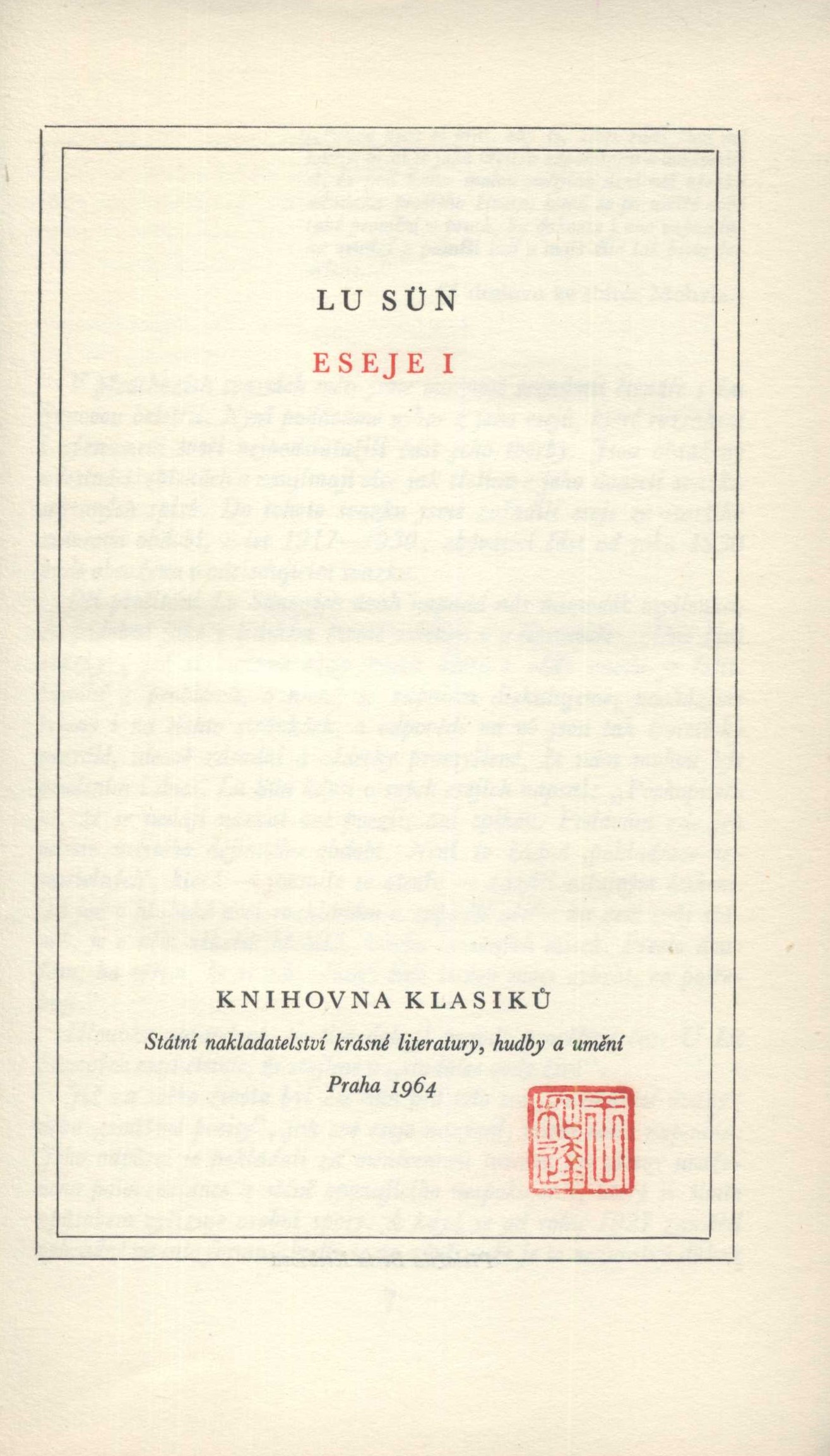 1. Názvové údajeEseje. I / Lu Sün ; z čínských originálů vybrala a přeložila, předmluvou a poznámkami opatřila Berta Krebsová