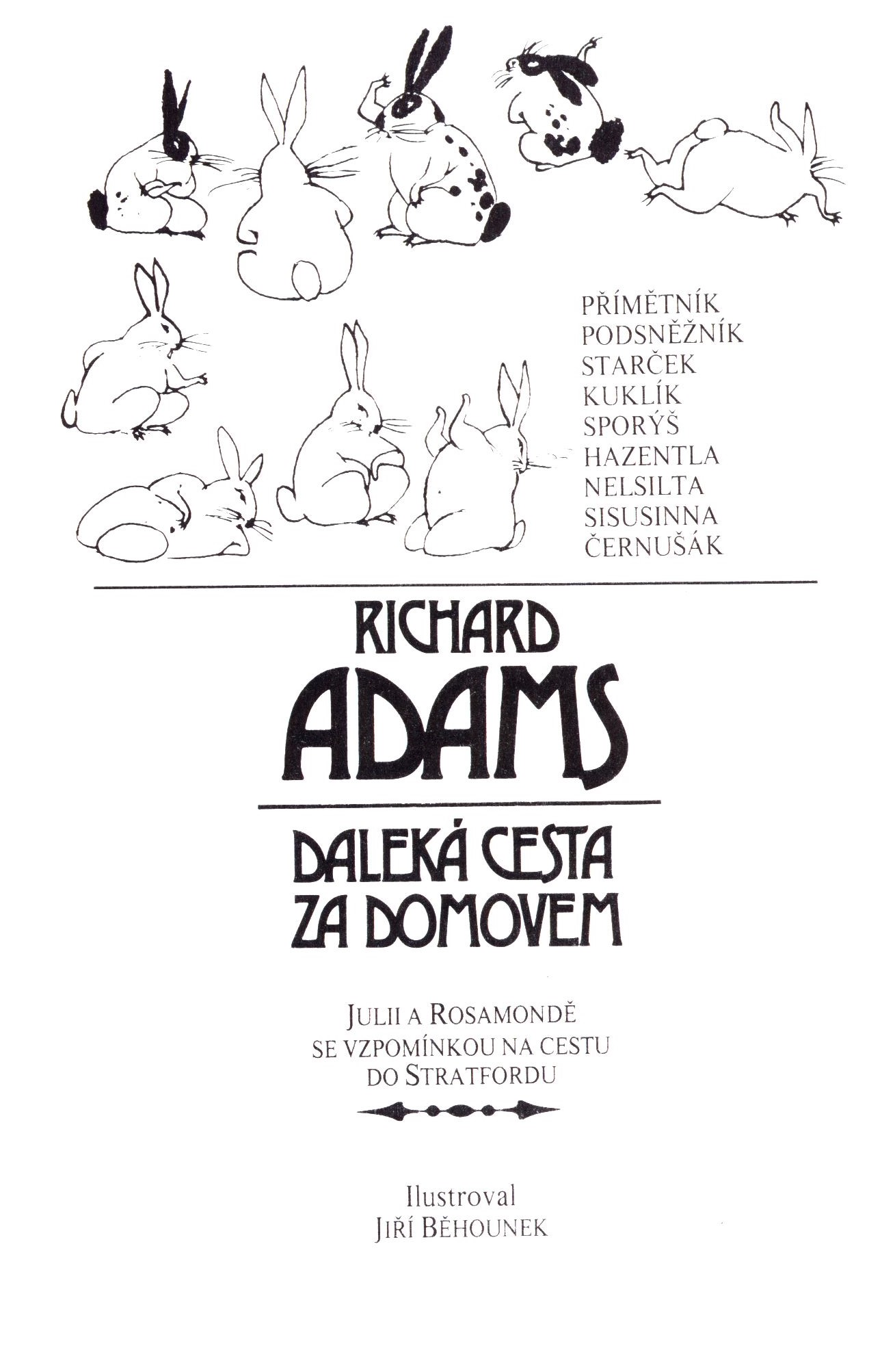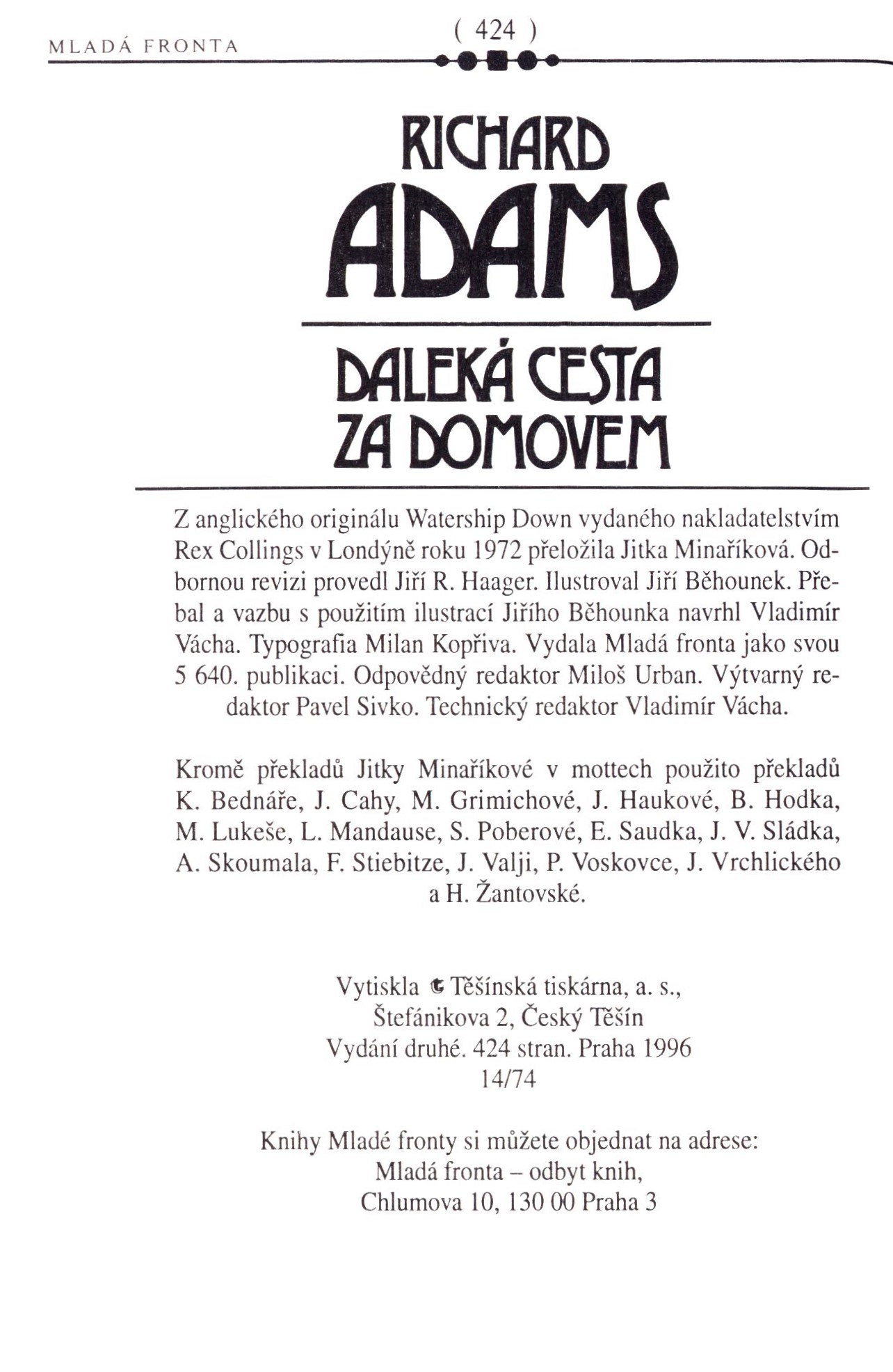 Názvové údaje Daleká cesta za domovem / Richard Adams ; z anglického originálu Watership Down ... přeložila Jitka Minaříková ; ilustroval Jiří Běhounek ; obal a vazbu s použitím ilustrací Jířího Běhounka navrhl Vladimír Vácha Osobní jméno Adams, Richard, 1920-2016 (Autor) Další autoři Běhounek, Jiří, 1929-2005 (Ilustrátor) Minaříková, Jitka, 1940- (Překladatel) Vácha, Vladimír, 1906- (Knižní grafik) (Autor obálky) Korp. Mladá fronta (nakladatelství) (Nakladatel, vydavatel) Těšínská tiskárna (Tiskař) Údaje o vydání vydání druhé Nakladatel Praha : Mladá fronta, [1996] Výrobce Český Těšín : Těšínská tiskárna, a.s. Copyright ©1986 Rozsah 424 stran : ilustrace ; 21 cm ISBN 80-204-0563-1 (vázáno) Země vyd. Česko Jazyk dok. čeština Jazyk orig. angličtina Poznámky Barevná zdobená obálka. - Na přední záložce obálky anotace, na zadní záložce bio-biliografická poznámka o autorovi. - Černobílé ilustrace.- Na zadní straně obálky ukázka z knihy.