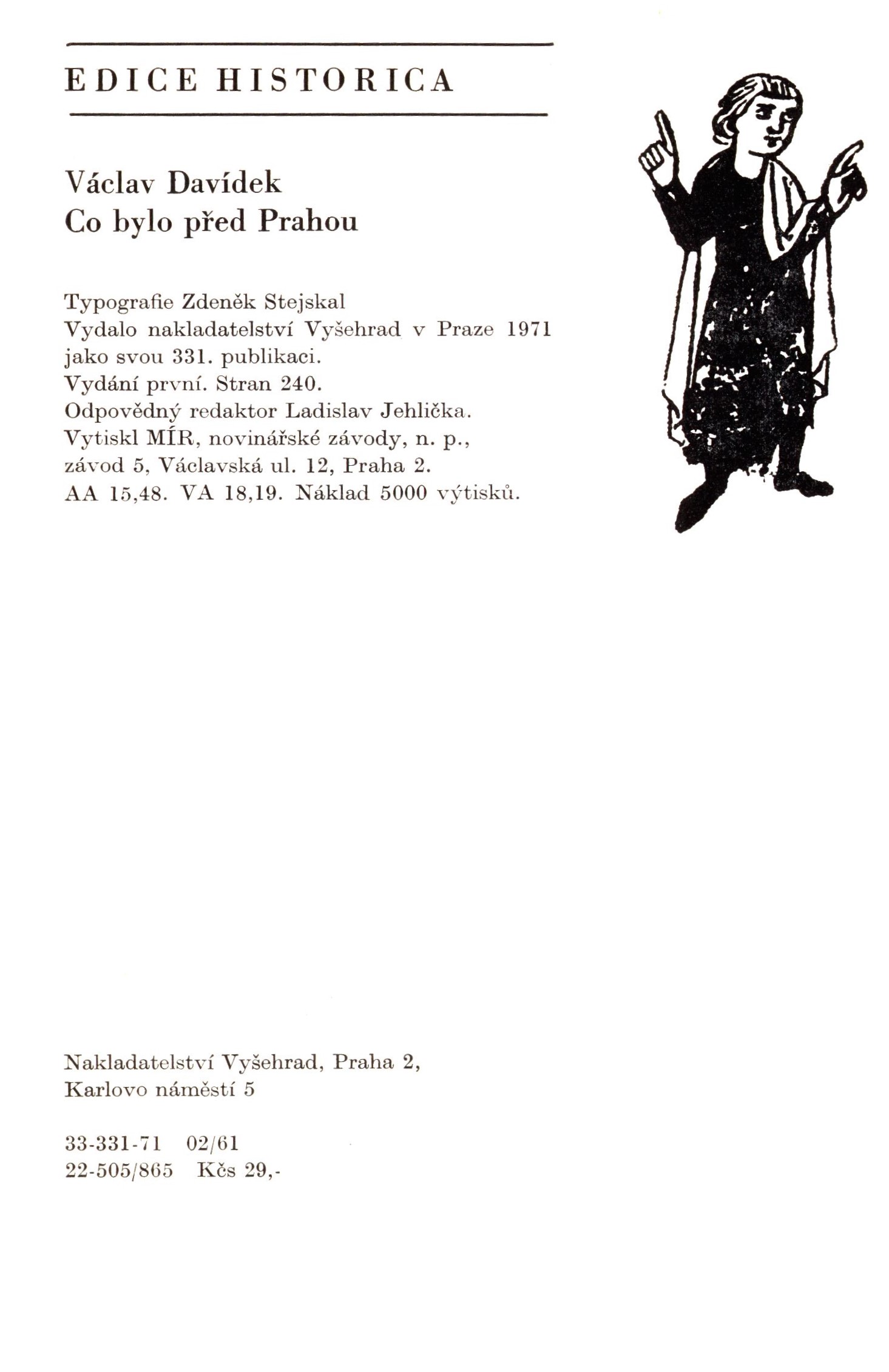 Názvové údaje Co bylo před Prahou / Václav Davídek ; typografie Zdeněk Stejskal Osobní jméno Davídek, Václav, 1913-1993 (Autor) Další autoři Stejskal, Zdeněk, 1945- (Typograf) Korp. Vyšehrad (nakladatelství) (Nakladatel, vydavatel) Mír, novinářské závody (tiskárna) (Tiskař) Údaje o vydání vydání první Nakladatel Praha : Vyšehrad, [1971] Výrobce Mír, novinářské závody, n.p., závod 5 Copyright ©1971 Rozsah 242 stran, 16 nečíslovaných stran obrazových příloh : ilustrace ; 21 cm ISBN (vázáno) Edice Historica