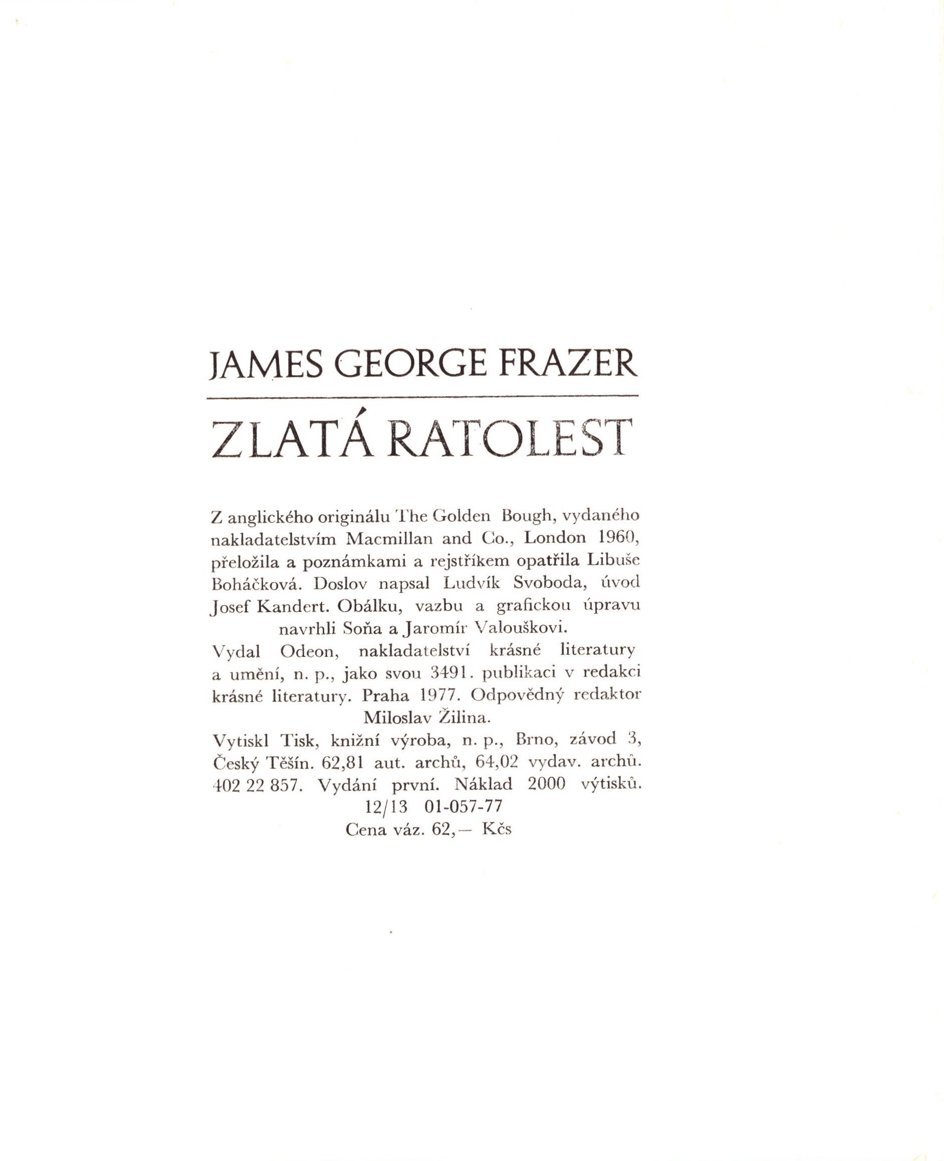 Title information Zlatá ratolest / James George Frazer ; z anglického originálu The Golden Bough ... přeložila a poznámkami a rejstříkem opatřila Libuše Boháčková ; doslov napsal Ludvík Svoboda ; úvod Josef Kandert ; obálku, vazbu a grafickou úpravu navrhli Soňa a Jaromír Valouškovi Personal name Frazer, James George, Sir, 1854-1941 (Author) Další autoři Boháčková, Libuše, 1927-1994 (Translator) Svoboda, Ludvík, 1903-1977 (Author of afterword, colophon, etc.) Kandert, Josef, 1943-2022 (Author of introduction) Valoušek, Jaromír, 1928- (Book designer) (Bookjacket designer) Valoušková, Soňa, 1940- (Book designer) (Bookjacket designer) Corporation Odeon (nakladatelství) (Book designer) Tisk Brno (tiskárna) (Bookjacket designer) Edition statement vydání první Publication Praha : Odeon, 1977 Manufacture Brno : Tisk, knižní výroba, n.p. Scope 741 stran ; 21 cm ISBN (vázáno) Country Czech Republic Language Czech Language of the original English Note Barevná zdobená obálka. - Černá plátěná vazba s ražbou. - Na obou záložkách knihy anotace. - Vysvětlivky. - Rejstřík. - 2 000 výtisků.