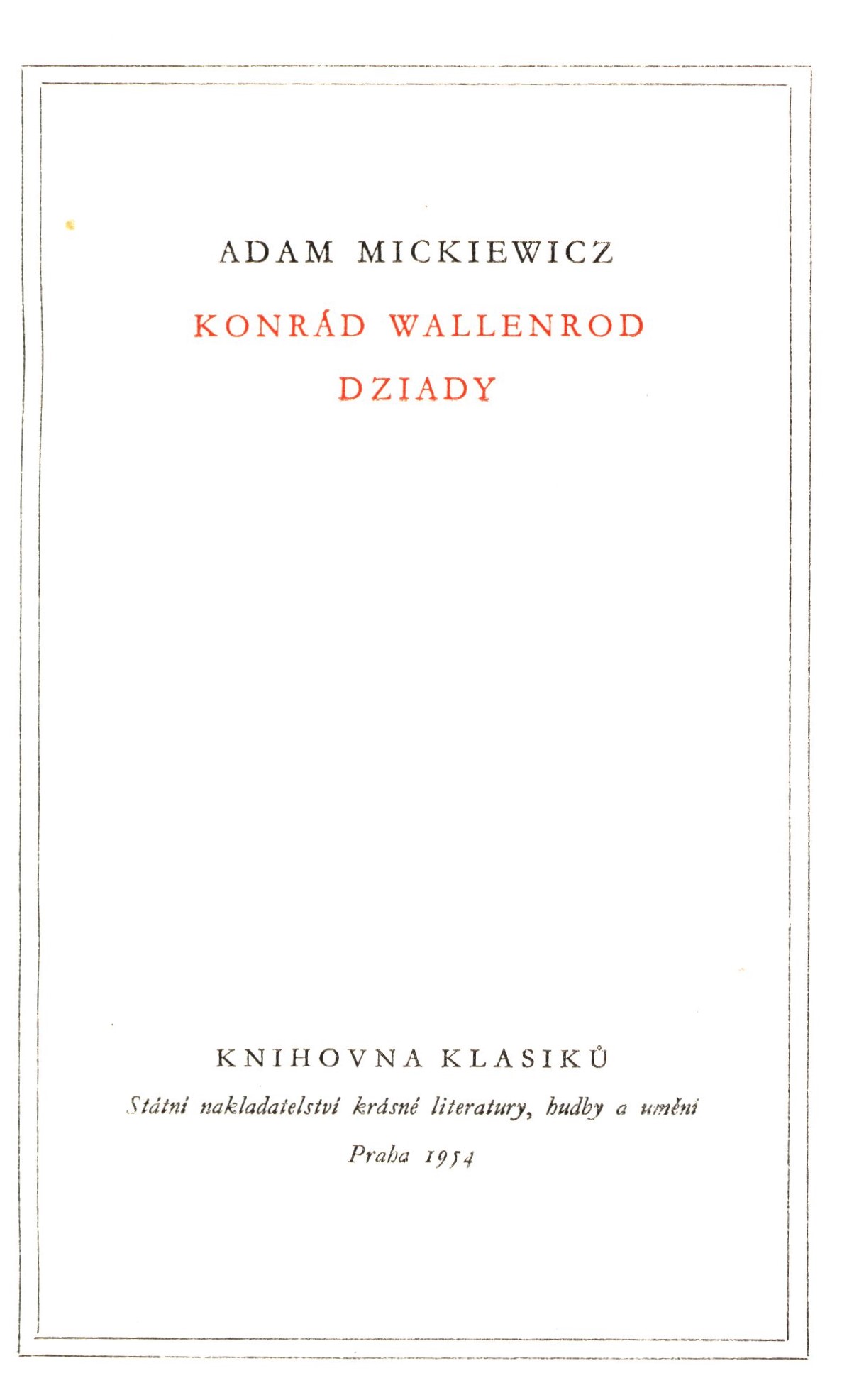 Knihovna klasiků, (Státní nakladatelství krásné literatury a umění) Spisy, Adam MickiewiczCountry Czech Republic Language Czech Language of the original Polish Note Barevná zdobená obálka. - Hnědá plátěná vazba s ražbou. - Poznámky. - 3 300 výtisků.
