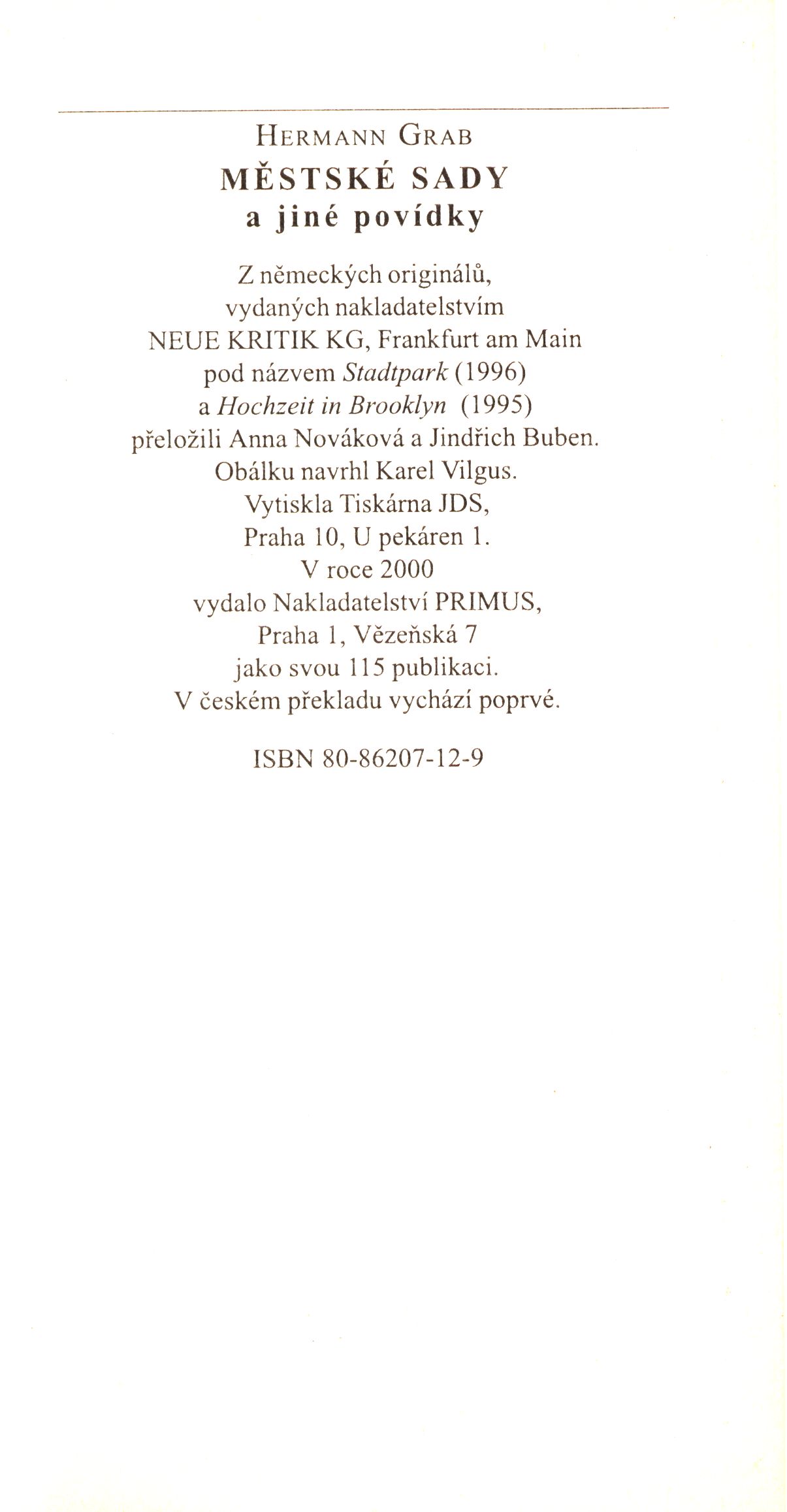 Názvové údaje Městské sady a jiné povídky / Hermann Grab ; z německých originálů ... přeložili Anna Nováková a Jindřich Buben ; obálku navrhl Karel Vilgus Osobní jméno Grab, Hermann, 1903-1949 (Autor) Další autoři Nováková, Anna, 1921-2005 (Překladatel) Buben, Jindřich (Překladatel) Vilgus, Karel, 1944- (Autor obálky) Korp. Primus (nakladatelství) (Nakladatel, vydavatel) Tiskárna JDS (Tiskař) Údaje o vydání V českém překladu vychází poprvé Nakladatel Praha : Primus, 2000 Výrobce Tiskárna JDS Rozsah 168 stran ; 21 cm ISBN 80-86207-12-9 (vázáno) Země vyd. Česko Jazyk dok. čeština Jazyk orig. němčina Poznámky Zdobená obálka. - Frontispis s fotografií autora. - Ediční poznámka. - Na zadní straně obálky poznámka o autorovi.