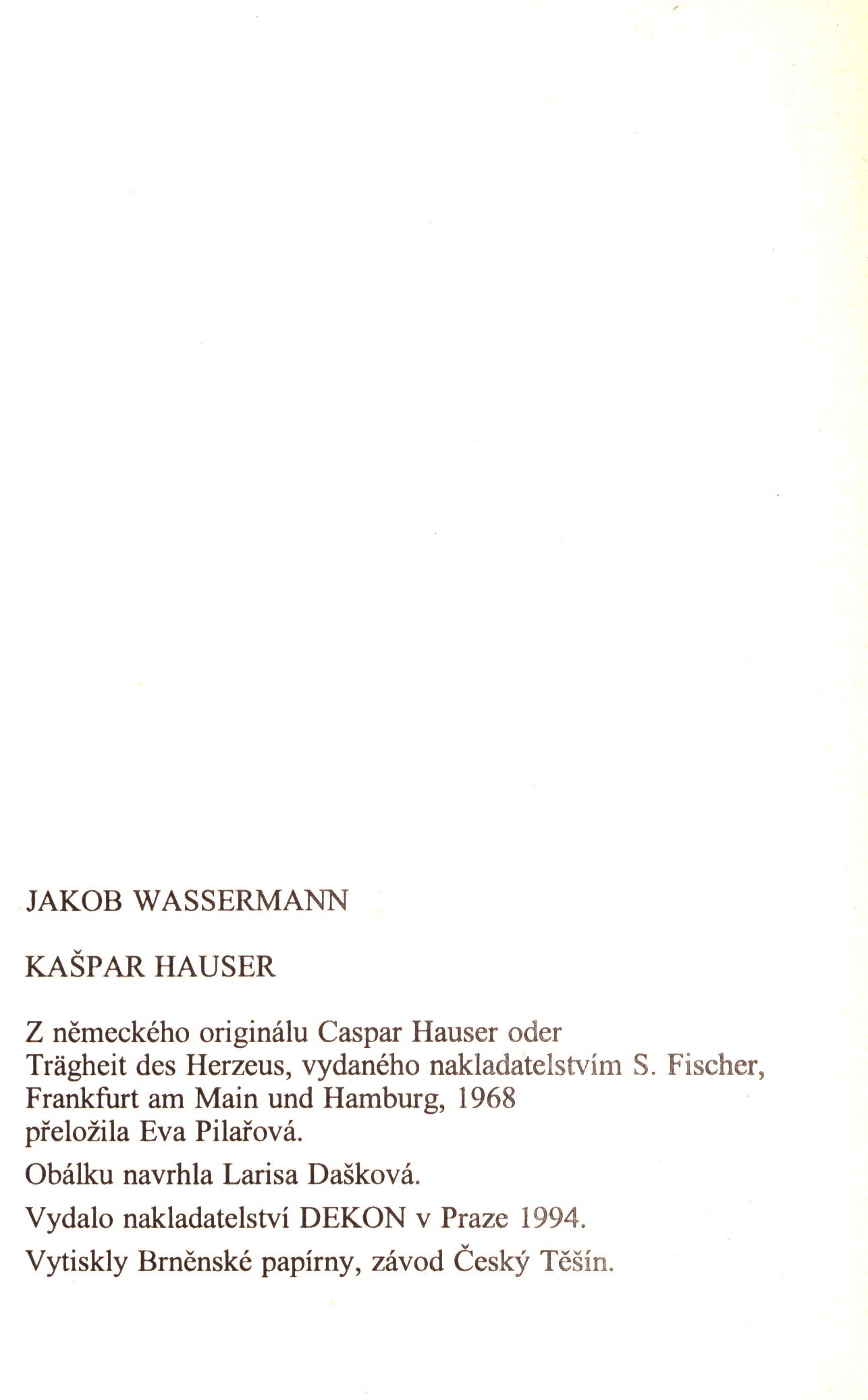 1. Názvové údajeKašpar Hauser / Jakob Wassermann ; z německého originálu Caspar Hauser oder Trägheit des Herzeus ... přeložila Eva Pilařová ; obálku navrhla Larisa Dašková