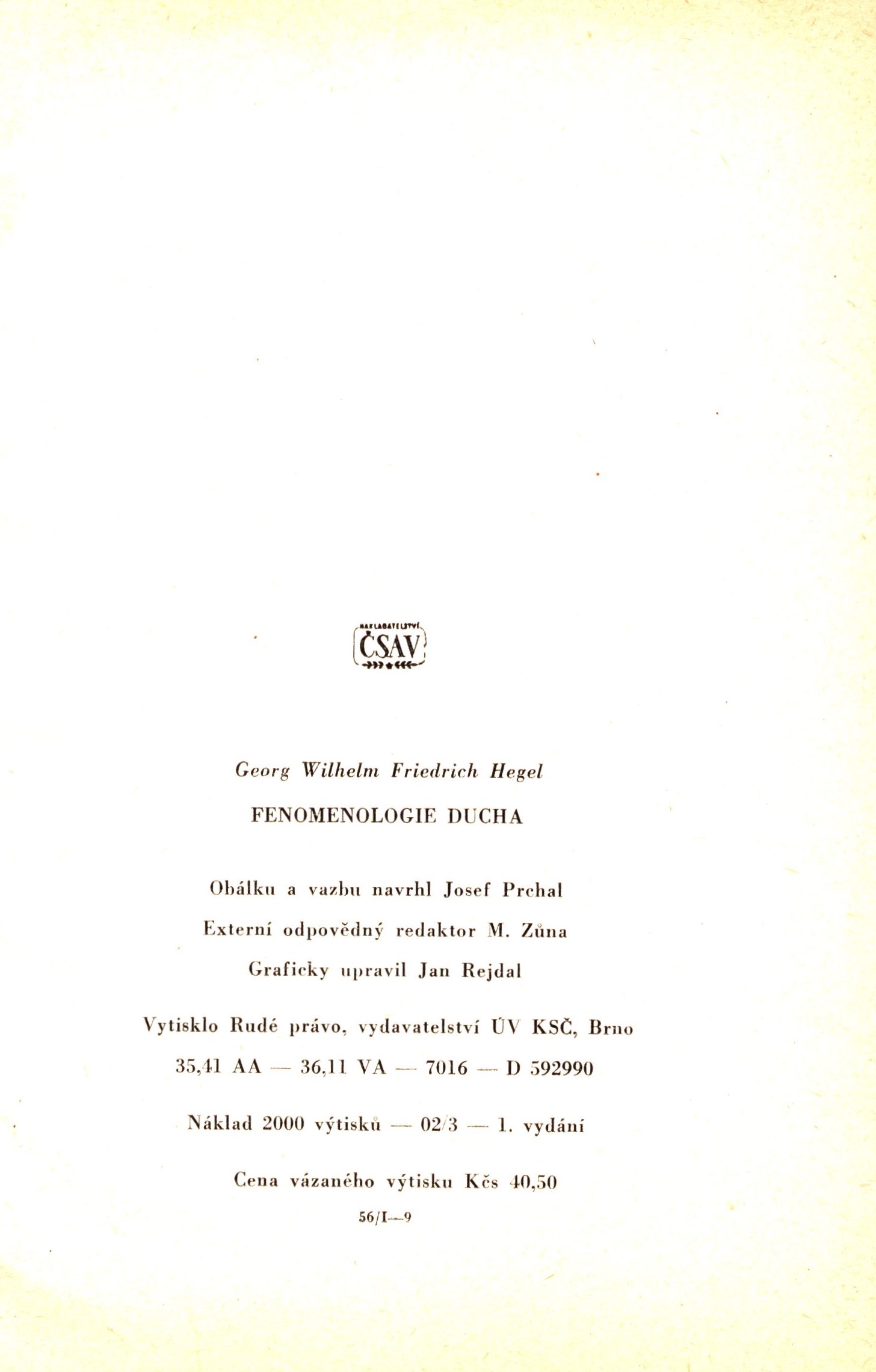 Filosofická knihovna, (Československá akademie věd)Země vyd. Česko Jazyk dok. čeština Jazyk orig. němčina Poznámky Barevná zdobená obálka. - Hnědá plátěná vazba. - Na přední záložce obálky anotace. - Dvoubarevný titulní list. - Poznámky. - 2 000 výtisků.