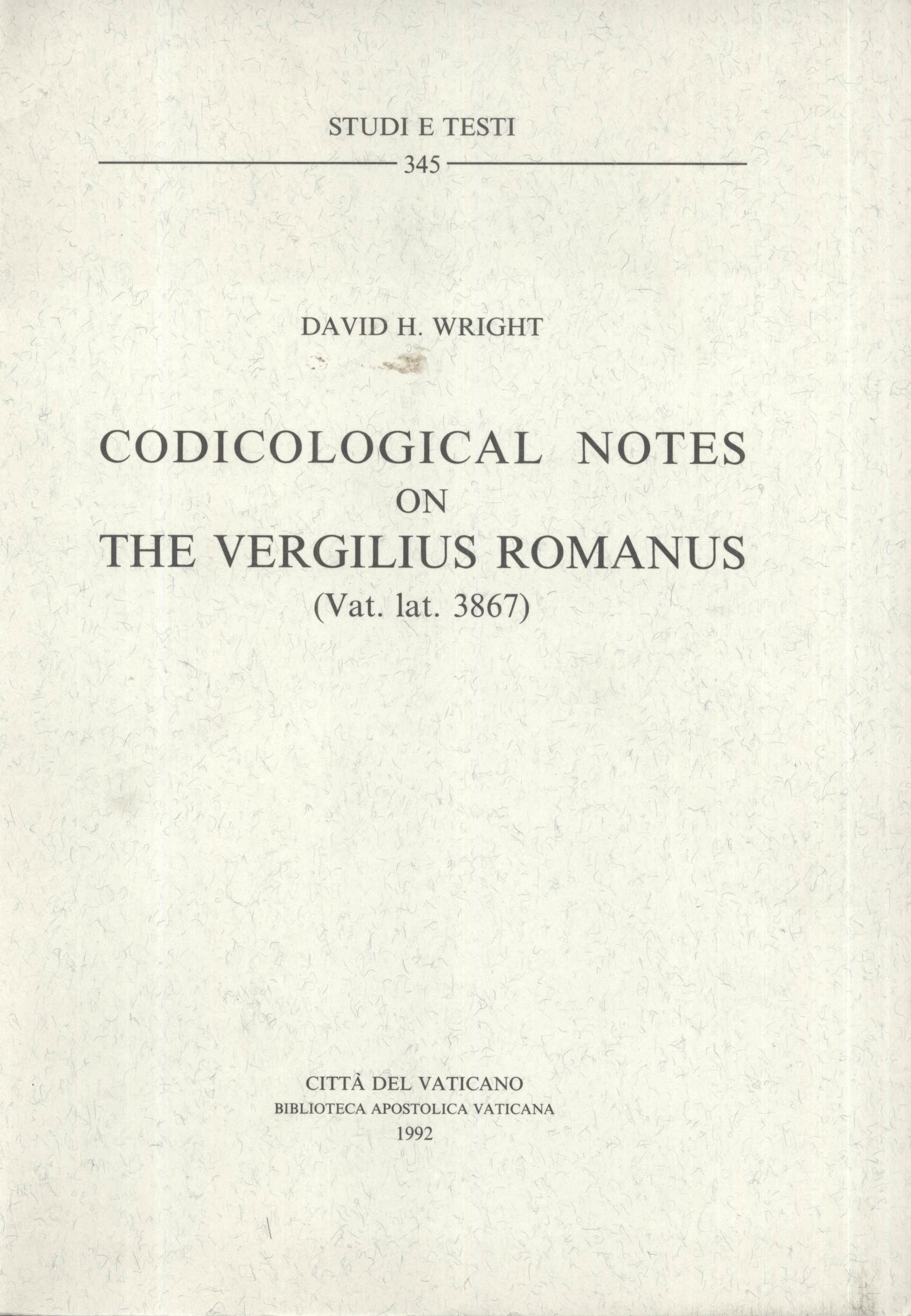 Názvové údaje Codicological Notes on the Vergilius Romanus : (Vat. lat. 3867) / Wright David H. Osobní jméno Wright, David Herndon, 1929-2018 (Autor) Další autoři Biblioteca Apostolica Vaticana (Řím) (1475-) (Nakladatel, vydavatel) Nakladatel Città del Vaticano : Biblioteca Apostolica Vaticana, 1992 Rozsah 129 stran : faksimile ; 24 cm ISBN 88-210-0641-7 (brožováno) Edice Studi e testi ; 345