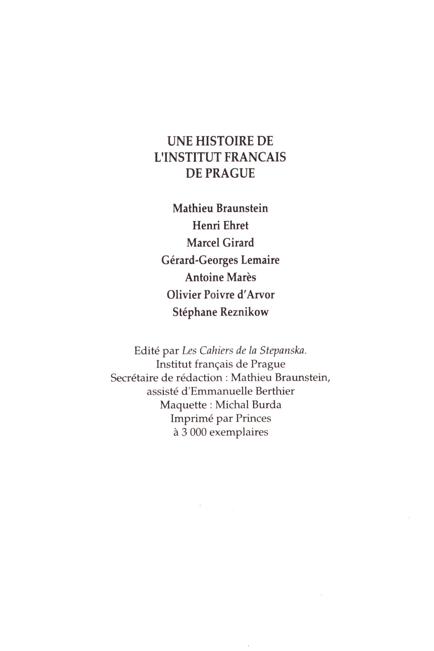 Cahiers de la Stepanska (Institut français de Prague)Země vyd. Česko Jazyk dok. francouzština Poznámky Barevná zdobená obálka. - Chronologický přehled. - 3000 výtisků.