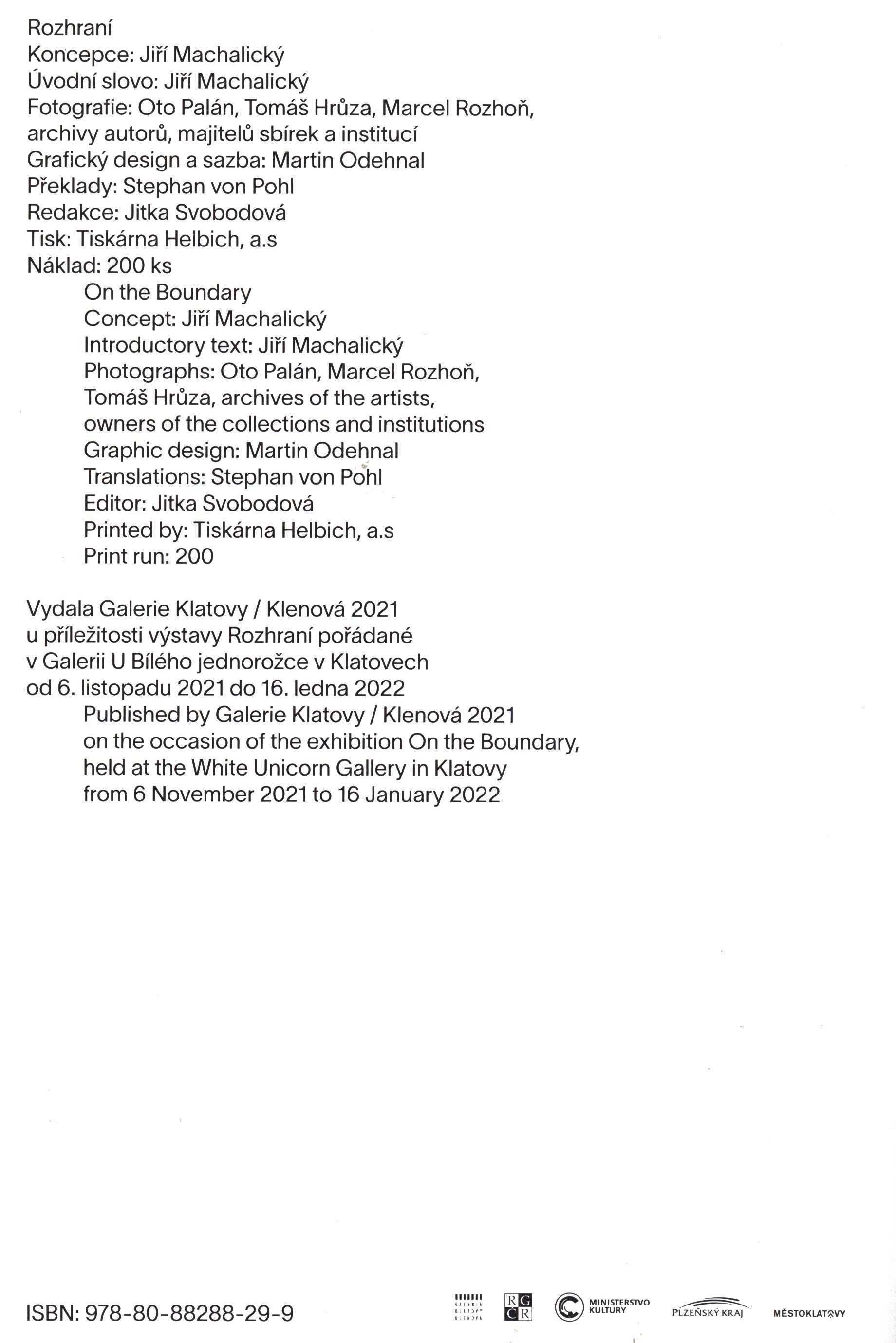Názvové údaje Rozhraní = On the boundary / úvodní slovo: Jiří Machalický ; překlady: Stephan von Pohl ; grafický design a sazba: Martin Odehnal Další autoři Machalický, Jiří, 1952- (Autor úvodu atd.) Pohl, Stephan von, 1971- (Překladatel) Odehnal, Martin, 1976- (Knižní grafik) Korp. Galerie Klatovy / Klenová (Nakladatel, vydavatel) Tiskárna Helbich (Tiskař) Nakladatel Klenová : Galerie Klatovy, 2021 Výrobce [Brno] : Tiskárna Helbich, a.s. Rozsah 75 stran : ilustrace (převážně barevné) ; 24 cm ISBN 978-80-88288-29-9 (brožováno) Země vyd. Česko Jazyk dok. čeština * angličtina Jazyk orig. čeština Poznámky Zdobená obálka. - Celostránkové barevné reprodukce. - 200 výtisků