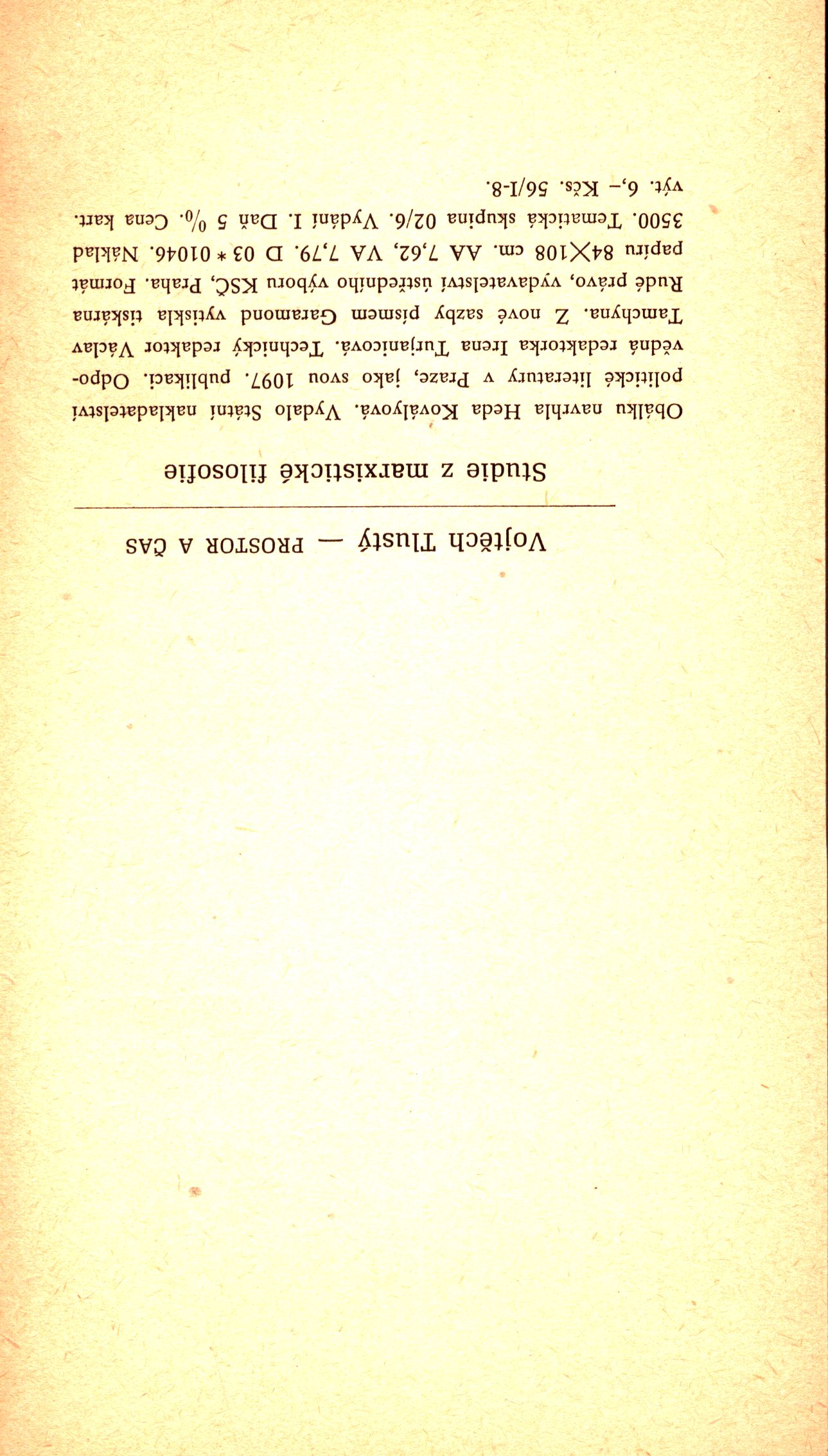 Názvové údaje Prostor a čas : studie z marxistické filosofie / Vojtěch Tlustý ; obálku navrhla Heda Kovályová Osobní jméno Tlustý, Vojtěch, 1921-1989 (Autor) Další autoři Kovályová, Heda, 1919-2010 (Autor obálky) Korp. Státní nakladatelství politické literatury (Nakladatel, vydavatel) Rudé právo (tiskárna, Praha) (Tiskař) Údaje o vydání vydání I. Nakladatel Praha : Státní nakladatelství politické literatury, 1960 Výrobce Rudé právo Rozsah 140 stran ; 20 cm ISBN (brožováno) Země vyd. Česko Jazyk dok. čeština Poznámky Barevná zdobená obálka. - Dvoubarevný titulní list. - Bibliografie. - 3500 výtiků.