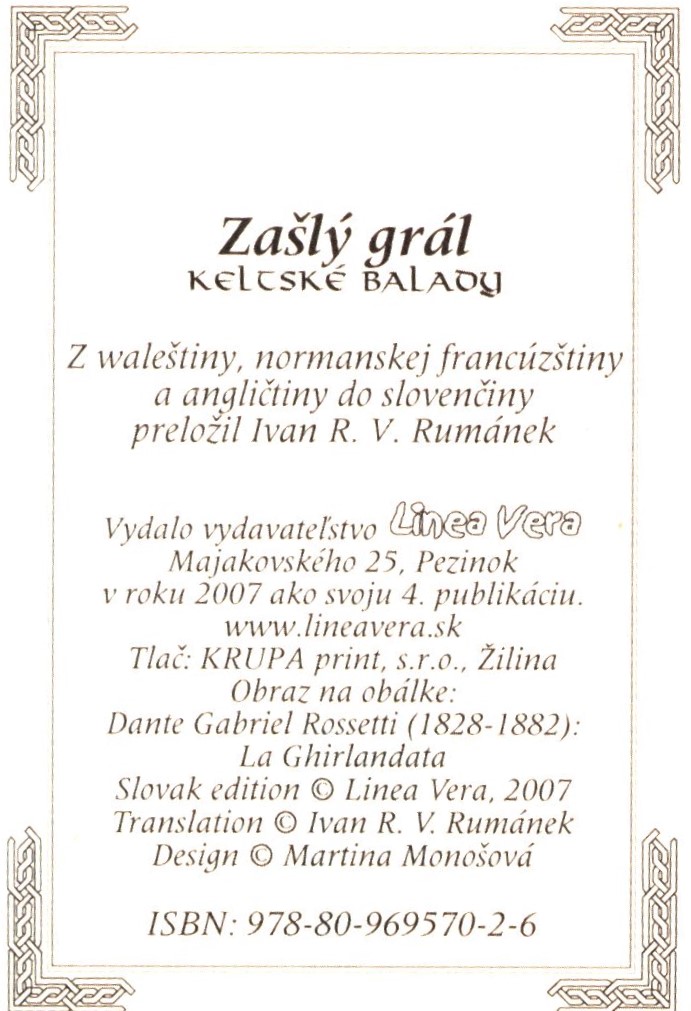 Názvové údaje Zašlý grál : keltské balady / v preklade a so sprievodným slovom Ivana R.V. Rumánka Osobní jméno Rumánek, Ivan R. V., 1967- (Autor úvodu atd.) (Překladatel) (Signatář) Další autoři Rossetti, Dante Gabriel, 1828-1882 (Ilustrátor) Monošová, Martina, 1972- (Knižní grafik) Korp. Linea Vera (nakladatelství) (Nakladatel, vydavatel) Krupa print, s.r.o. (tiskárna) (Tiskař) Nakladatel Pezinok : Linea Vera, 2007 Výrobce Žilina : Krupa print, s.r.o. Rozsah 95 stran : ilustrace ; 11 cm ISBN 978-80-969570-2-6 (vázáno) Země vyd. Slovensko Jazyk dok. slovenština Jazyk orig. velština * francouzština * angličtina Poznámky Barevná zdobená obálka. - Zdobený titulní list. - Ilustrace.