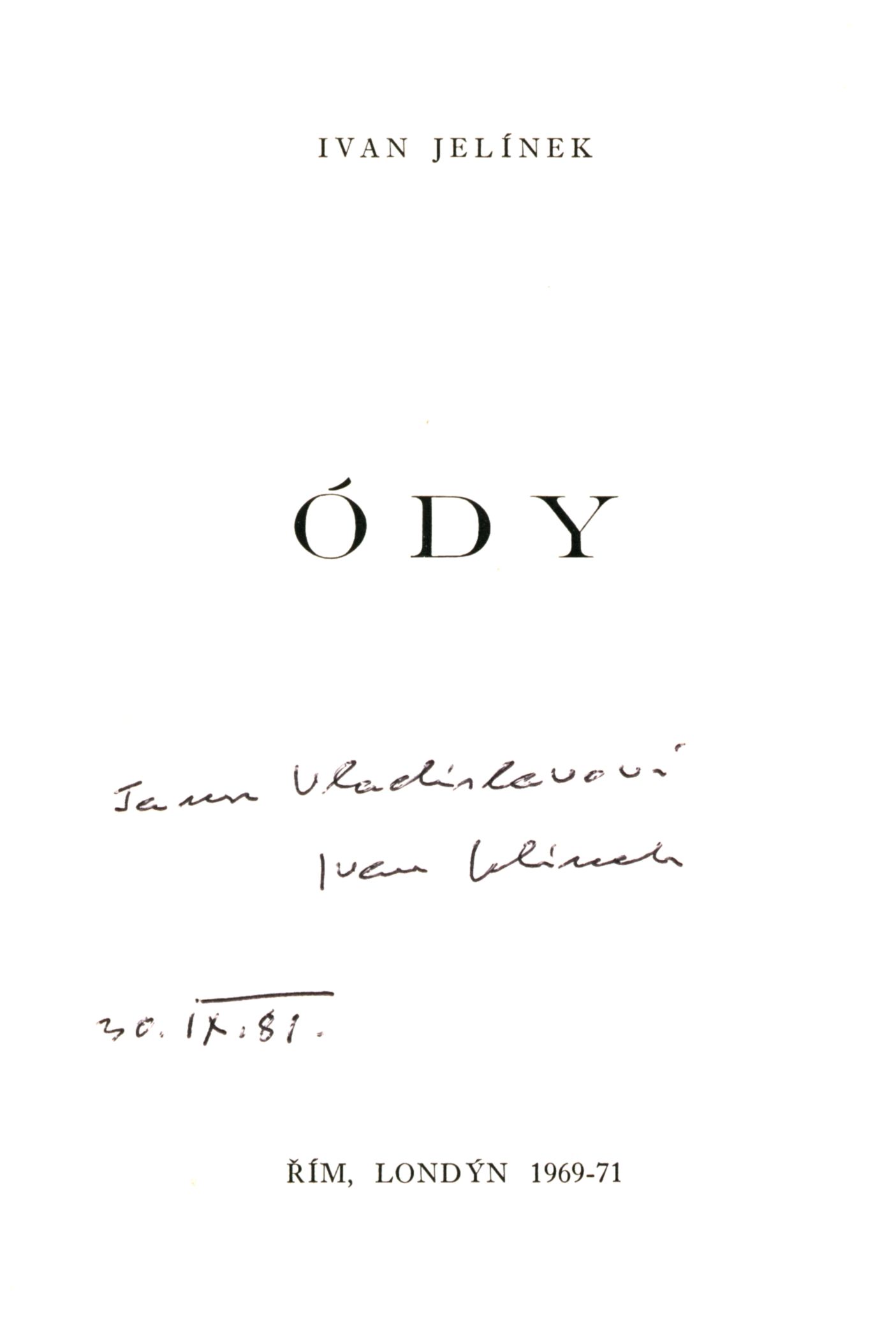 Názvové údaje Ódy / Ivan Jelínek Osobní jméno Jelínek, Ivan, 1909-2002 (Autor) (Dedikátor) (Nakladatel, vydavatel) Další autoři Vladislav, Jan, 1923-2009 (Dedikant) Korp. Tipografia P. U. G. (tiskárna) (Tiskař) Nakladatel Řím : Ivan Jelínek, 1971 Výrobce Tipografia P.U.G. Rozsah 77 stran ; 19 cm ISBN (Brožováno) Země vyd. Itálie Jazyk dok. čeština Poznámky Barevná zdobená obálka. - Bibliografie autora v tiráži. - Obsah.