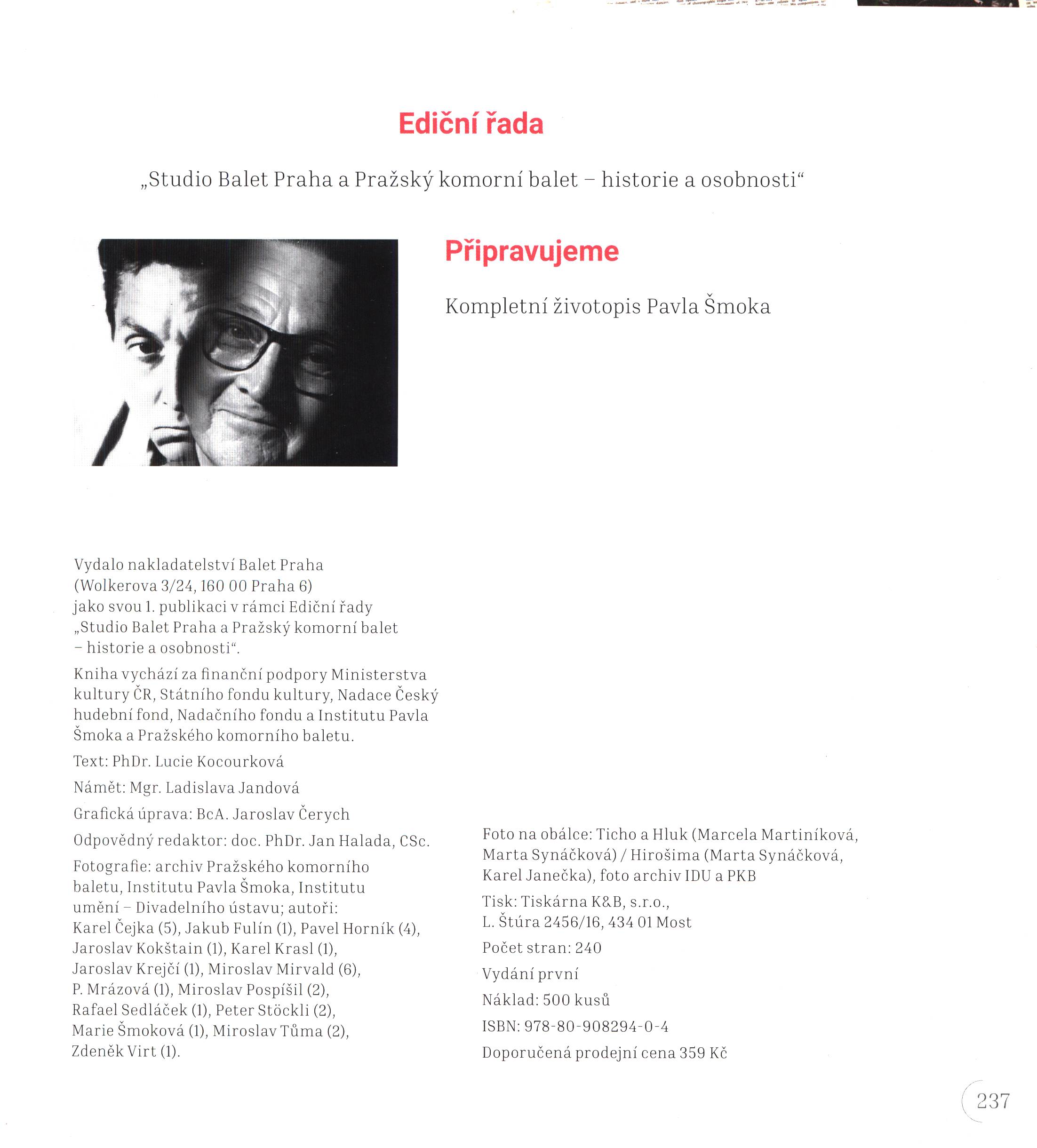 Studio Balet Praha a Pražský komorní balet - historie a osobnosti, (Balet Praha)Země vyd. Česko Jazyk dok. čeština Poznámky Pevná vazba bez přebalu s fotografiemi na přední i zadní straně. - Zdobené předsádky. - 500 výtisků.