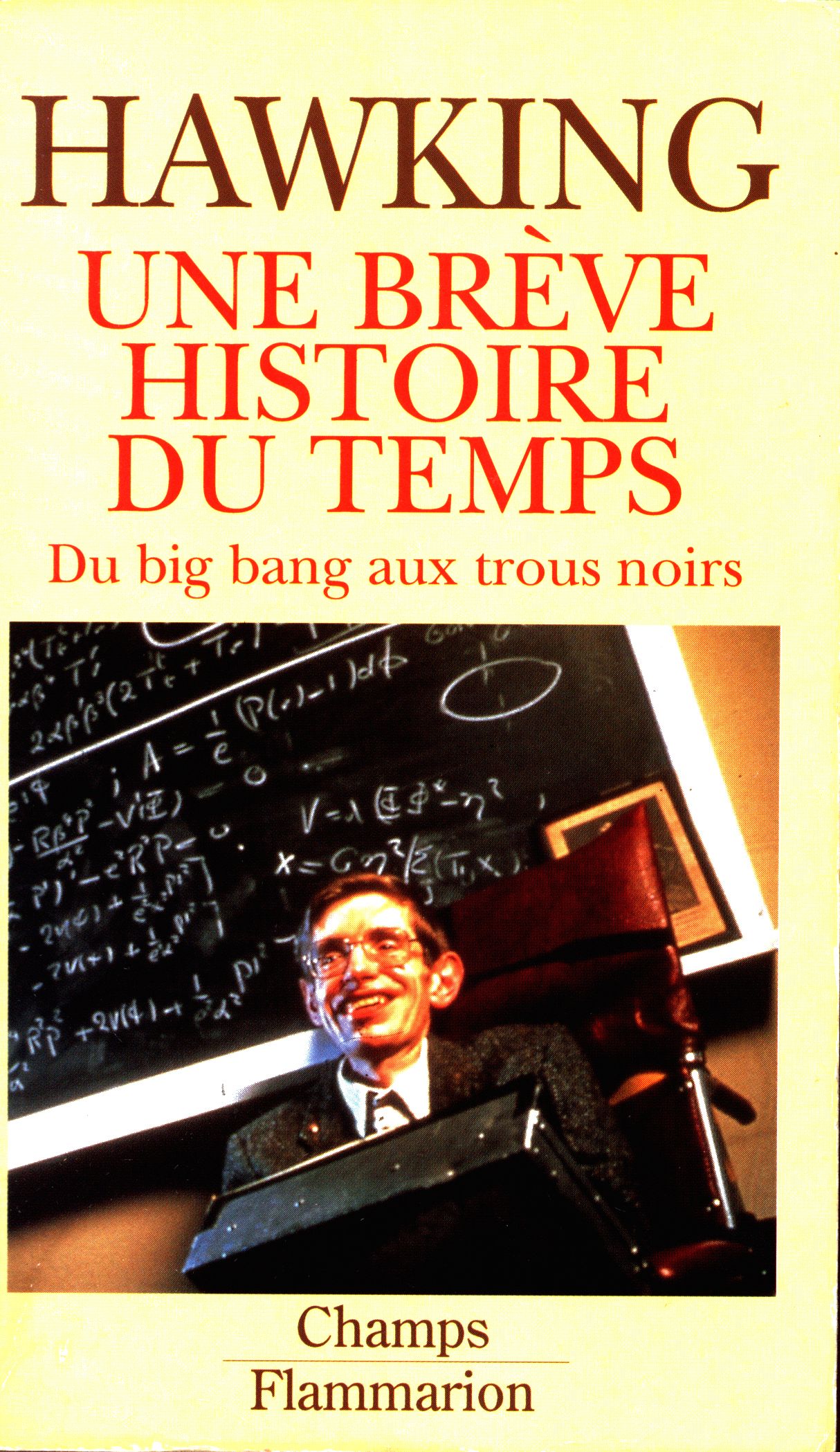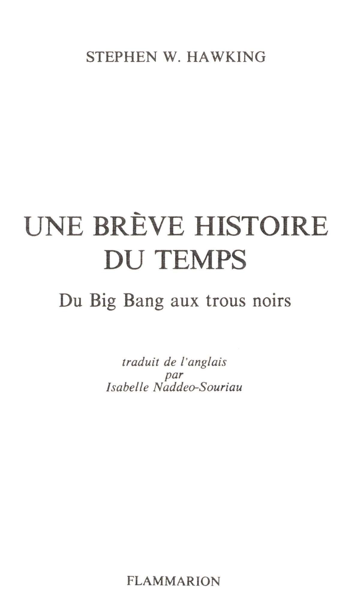Title information Une brève histoire du temps : du big bang aux trous noirs / Stephen W. Hawking ; traduit de l'anglais par Isabelle Naddeo-Souriau Personal name Hawking, Stephen William, 1942-2018 (Author) Další autoři Souriau, Isabelle, 1948-2018 (Translator) Gamble, David (Photographer) Corporation Flammarion (nakladatelství) (Publisher) Publication [Paris] : Flammarion, [1991] Copyright notice date ©1989 Scope 245 stran, 16 nečíslovaných stran obrazových příloh : černobílé ilustrace ; 18 cm ISBN 2-08-081238-6 (brožováno) Country France Language French Note Barevná zdobená obálka. - Černobílé ilustrace. - Glosář. - Rejstřík. - Obsah. - Na zadní straně obálky anotace.