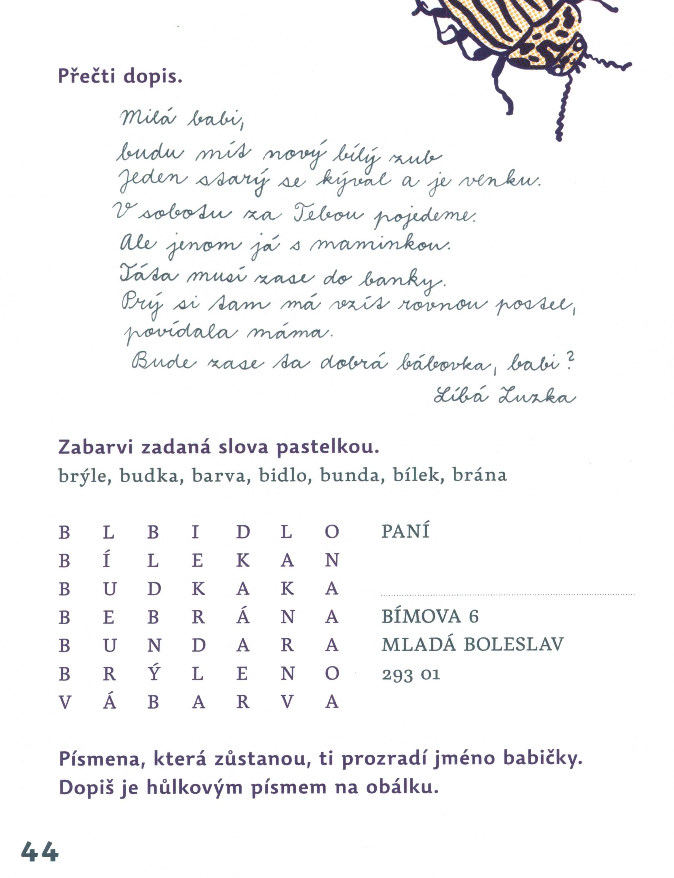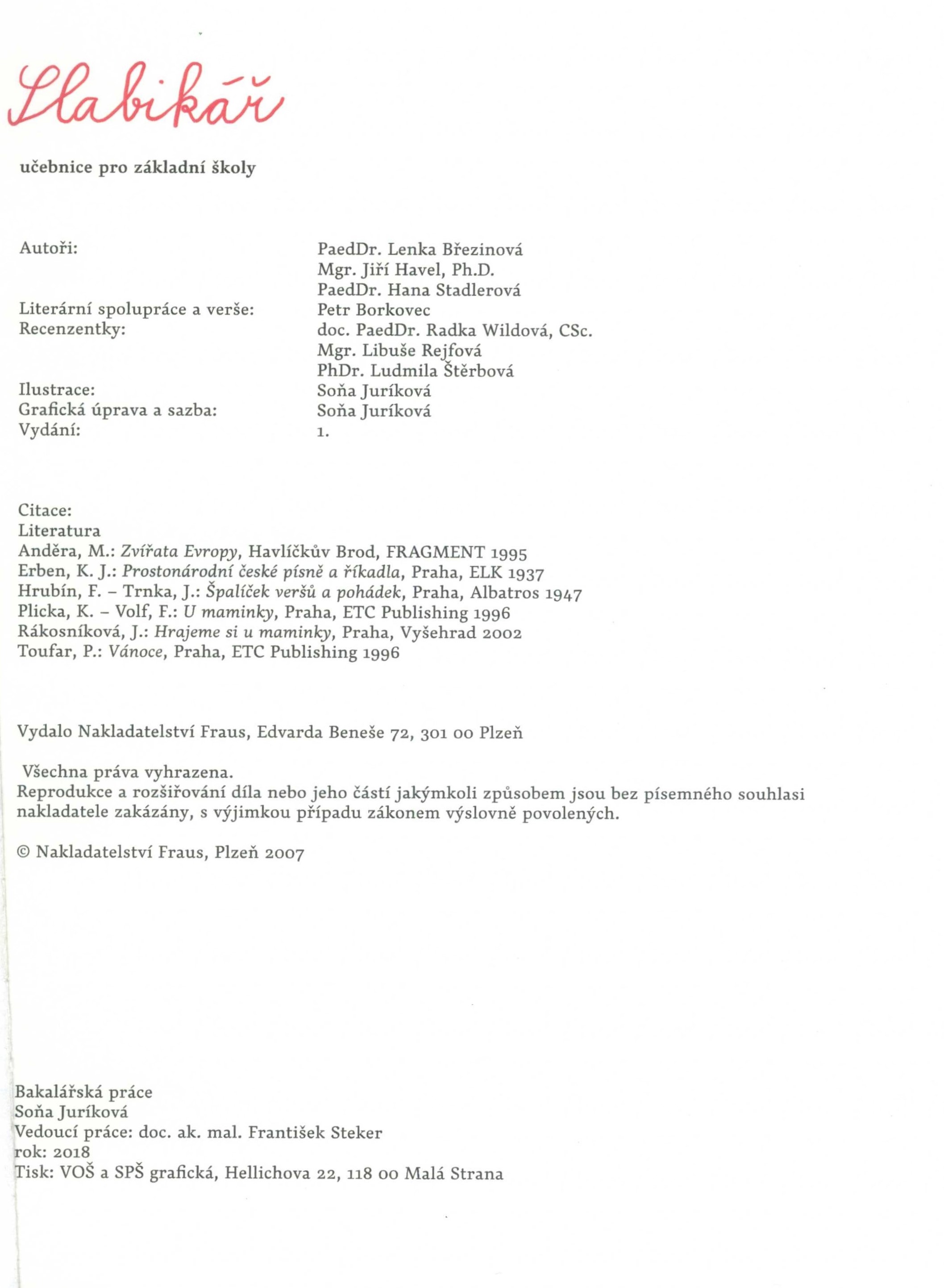 Názvové údaje Slabikář / Lenka Březinová, Jiří Havel, Hana Stadlerová ; literární spolupráce a verše Petr Borkovec ; ilustrovala Soňa Juríková ; grafická úprava a sazba Soňa Juríková Osobní jméno Březinová, Lenka, 1961- (Autor) Další autoři Havel, Jiří, 1968- (Autor) Stadlerová, Hana, 1962- (Autor) Borkovec, Petr, 1970- (Jiná role) (Autor) Juríková, Soňa, 1995- (Ilustrátor) (Knižní grafik) (Sazeč) Korp. Nakladatelství Fraus (Nakladatel, vydavatel) Vyšší odborná škola grafická a Střední průmyslová škola grafická (Praha, Česko) (Tiskař) Další var.názvy Učebnice pro základní školy Údaje o vydání 1. vydání Nakladatel Plzeň : Nakladatelství Fraus, 2018 Výrobce Praha : VOŠ a SPŠ grafická Copyright ©2007 Rozsah 97 stran : ilustrace ; 26,5 cm ISBN (Vázáno) Země vyd. Česko Jazyk dok. čeština Poznámky Barevně zdobená vazba, dvoubarevný text. - Barevná abeceda a drobné ilustrace na přídeští. - Titulní list s červeným textem. - Na rubu titulního listu drobná barevná ilustrace. - Úvod autorů. - Barevná ilustrace. - Obsah. - Drobné i celostránkové ilustrace v textu, vícebarevný text. - Obrázková abeceda. - Tiráž.