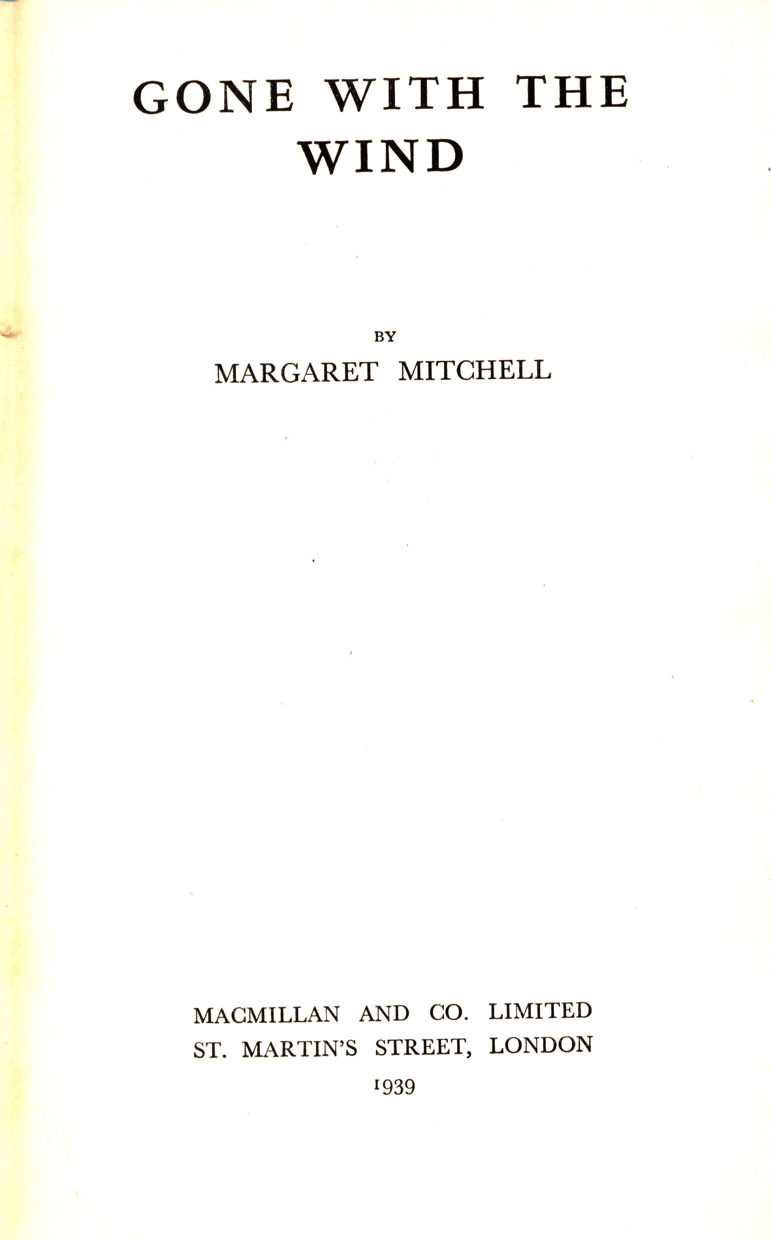 Názvové údaje Gone with the wind / by Margaret Mitchell Osobní jméno Mitchell, Margaret, 1900-1949 (Autor) Další autoři Macmillan & Co. (Nakladatel, vydavatel) Richard Clay & Co (Tiskař) Nakladatel London : Macmillan and Co. Limited, 1939 Výrobce Bungay : Richard Clay and Company, Ltd. Rozsah 795 stran ; 22 cm ISBN (vázáno) Země vyd. Velká Británie Jazyk dok. angličtina Poznámky Celoplátěná vazba. - Věnování.