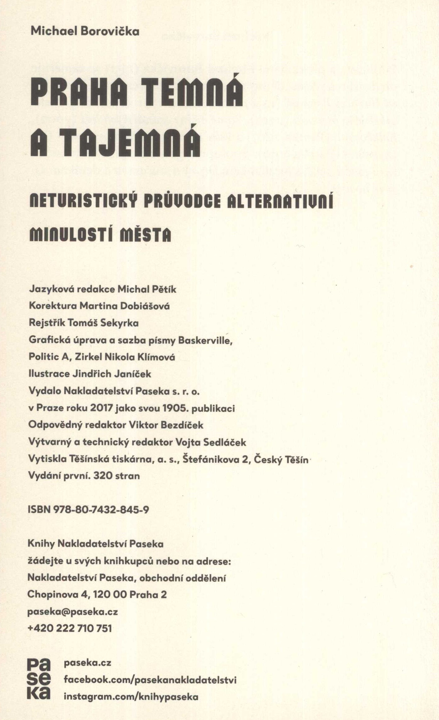 Title information Praha temná a tajemná : neturistický průvodce alternativní minulostí města / Michael Borovička ; grafická úprava a sazba Nikola Klímová ; ilustrace Jindřich Janíček Personal name Borovička, Michael, 1951- (Author) Další autoři Klímová, Nikola, 1990- (Compositor) Janíček, Jindřich, 1990- (Illustrator) Corporation Nakladatelství Paseka (Publisher) Těšínská tiskárna (Printer) Edition statement Vydání první Publication V Praze : Paseka, 2017 Manufacture Český Těšín : Těšínská tiskárna, a.s. Scope 314 stran : barevné ilustrace ; 21 cm ISBN 978-80-7432-845-9 (vázáno) Country Czech Republic Language Czech Note Modročerná ilustrovaná vazba, dvoubarevný text (na hřbetu černý). - Modré předsádky s drobnými portréty. - Modré listy. - Patitul. - Rozložený modročerný titulní list s vícebarevným textem. - Obsah. - Předmluva. - Jednotlivé kapitoly (černý list s citací). - Barevné ilustrace na dvoulistech. - O autorovi.