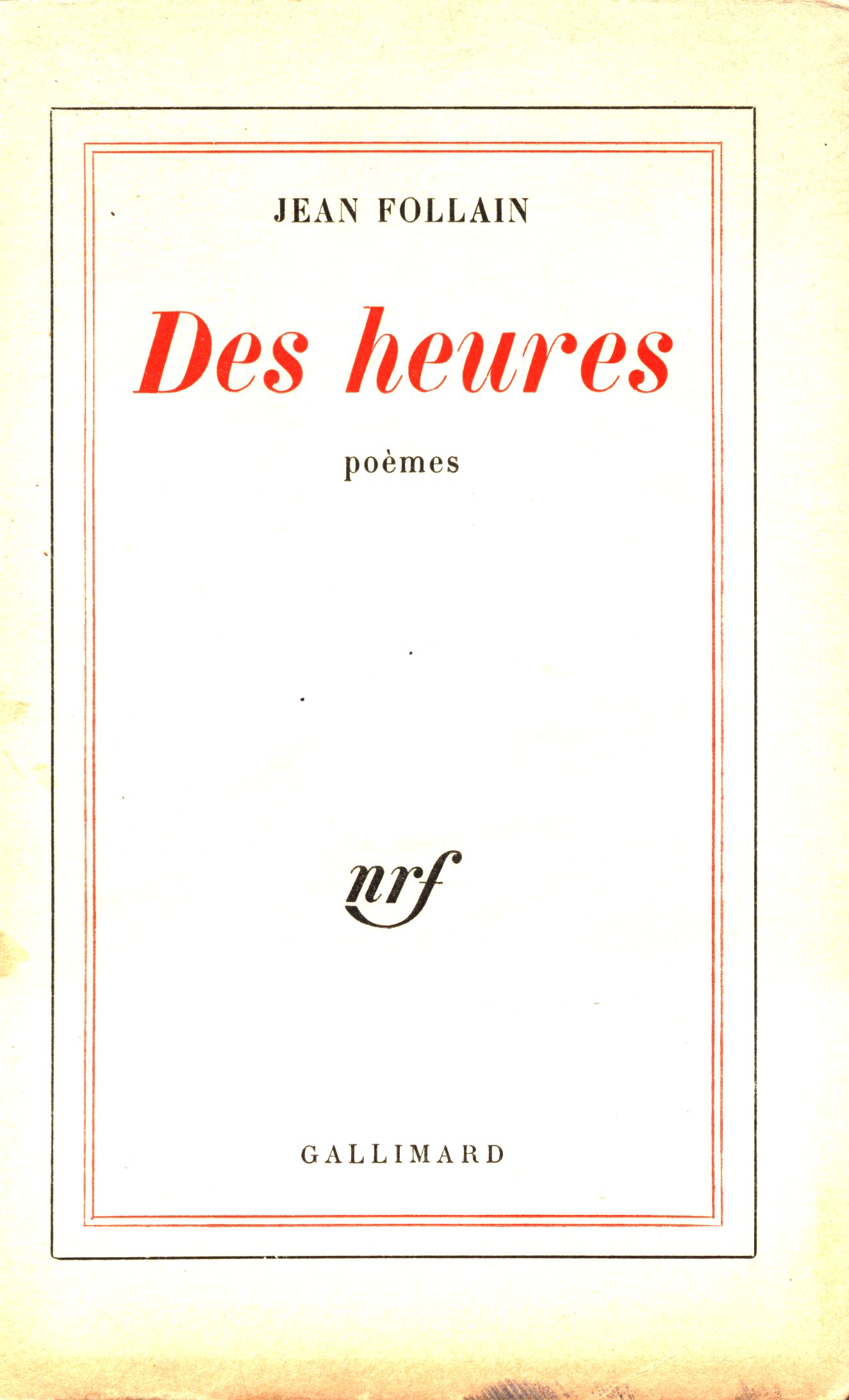 Názvové údaje Des heures : poems / Jean Follain Osobní jméno Follain, Jean, (Autor) 1903-1971 Další autoři Gallimard (firma) (Nakladatel, vydavatel) Emmanuel Grevin (Lagny-sur-Marne, Francie) (Tiskař) Nakladatel Paris : Gallimard, 1960 Výrobce Lagny-sur-Marne : Emmanuel Grevin Rozsah 101 stran ; 19 cm ISBN (brožováno) Země vyd. Francie Jazyk dok. francouzština Poznámky Barevná zdobená obálka. - Na frontispisu soupis děl autora. - Titulní list s nakladatelskou značkou. - Na zadní straně obálky anotace.