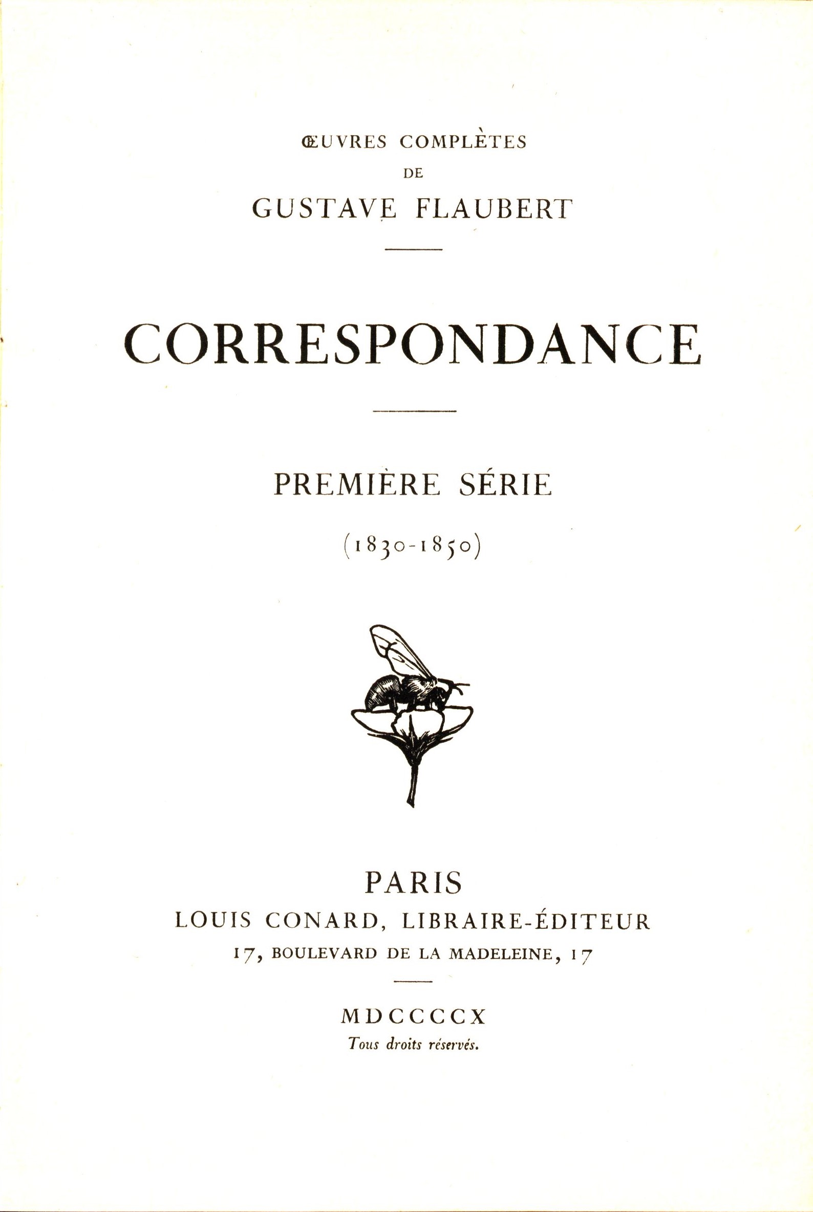 Názvové údaje Correspondance. Première Série, (1830-1850) / Gustave Flaubert Osobní jméno Flaubert, Gustave, 1821-1880 (Autor) Další autoři Louis Conard (nakladatelství) (Nakladatel, vydavatel) Nakladatel Paris : Louis Conard, 1910 Rozsah 474 stran ; 21 cm ISBN (vázáno) Edice Oeuvres complètes, Gustave Flaubert