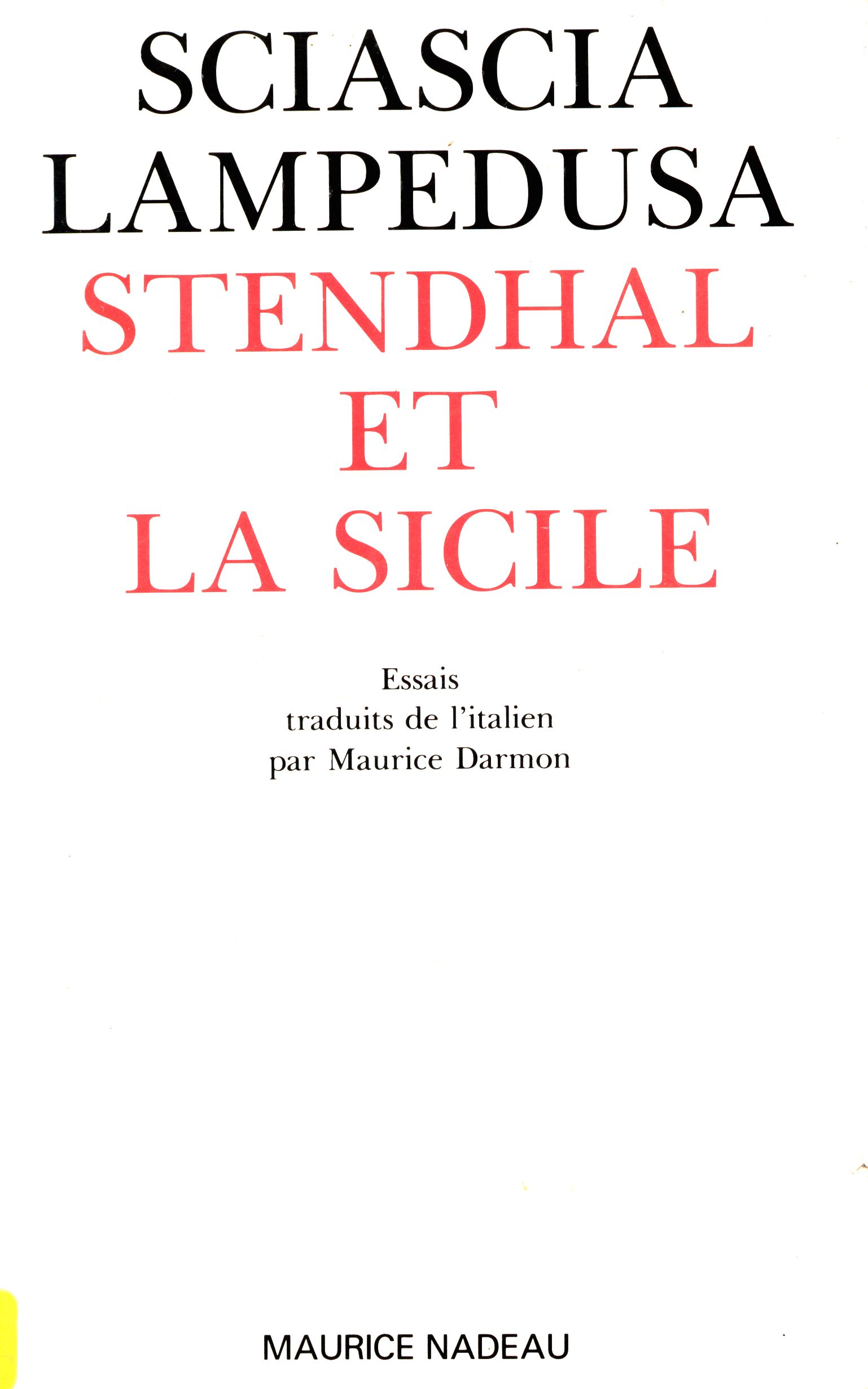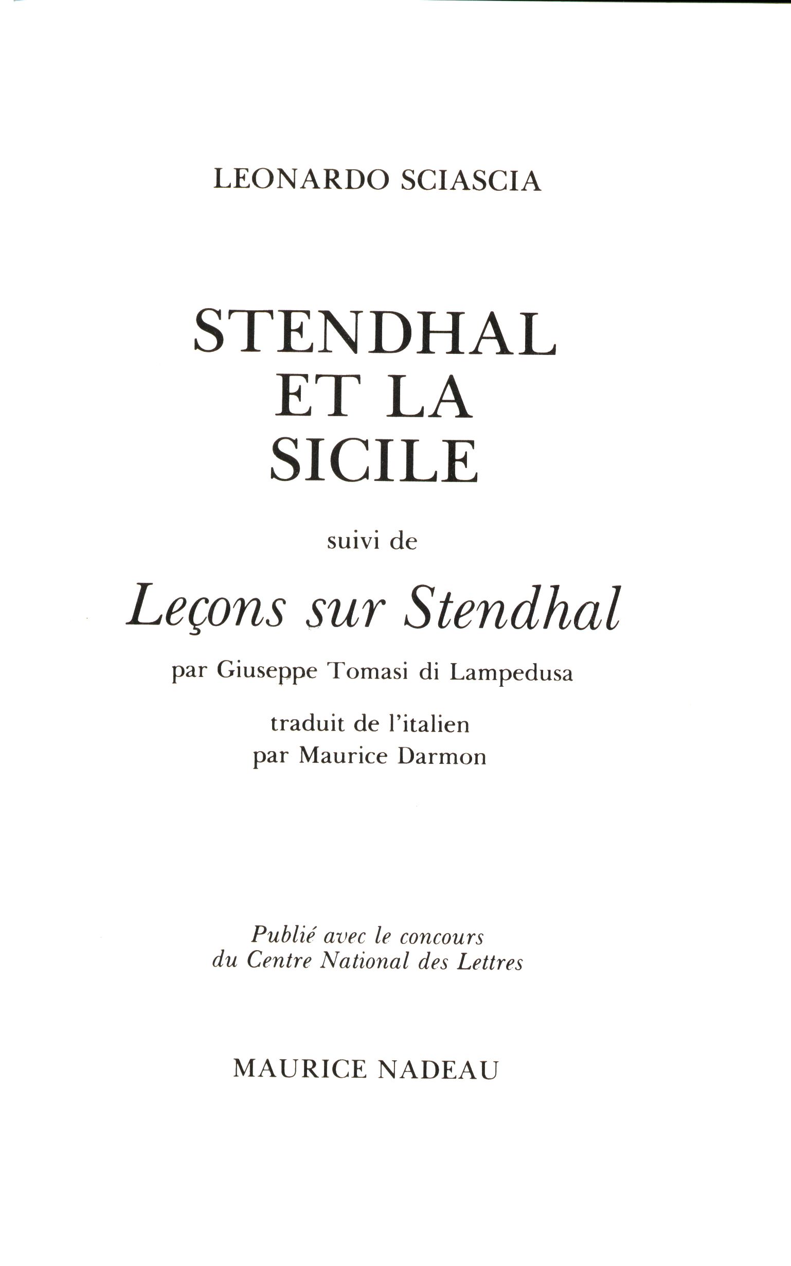 Názvové údaje Stendhal et la Sicile : suvi de Lecons sur Stendhal / Leonardo Sciascia; par Giuseppe Tomasi di Lampedusa; traduit de l'italien par Maurice Darmon Osobní jméno Sciascia, Leonardo, 1921-1989 (Autor) Další autoři Tomasi di Lampedusa, Giuseppe, 1896-1957 (Autor) Darmon, Maurice, 1943- (Překladatel) Korp. Maurice Nadeau (nakladatelství) (Nakladatel, vydavatel) Floch (francouzská tiskárna) (Tiskař) Nakladatel [místo vydání neuvedeno] : Maurice Nadeau, 1965 Výrobce Mayenne : Floch Rozsah 178 stran ; 21 cm ISBN 2-86231-054-9 (brožováno) Země vyd. Francie Jazyk dok. francouzština Poznámky Barevná zdobená obálka. - Na frontispisu soupis děl autora. - Poznámky. - Na zadní straně obálky anotace.