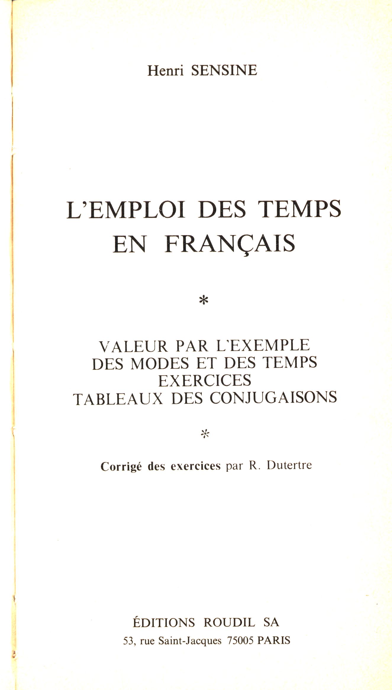 L'emploi des temps en francais (Éditions Roudil SA)Země vyd. Francie Jazyk dok. francouzština Poznámky Zdobená obálka. - Na frontispisu soupis děl z edice. - Poznámky. - Obsah.