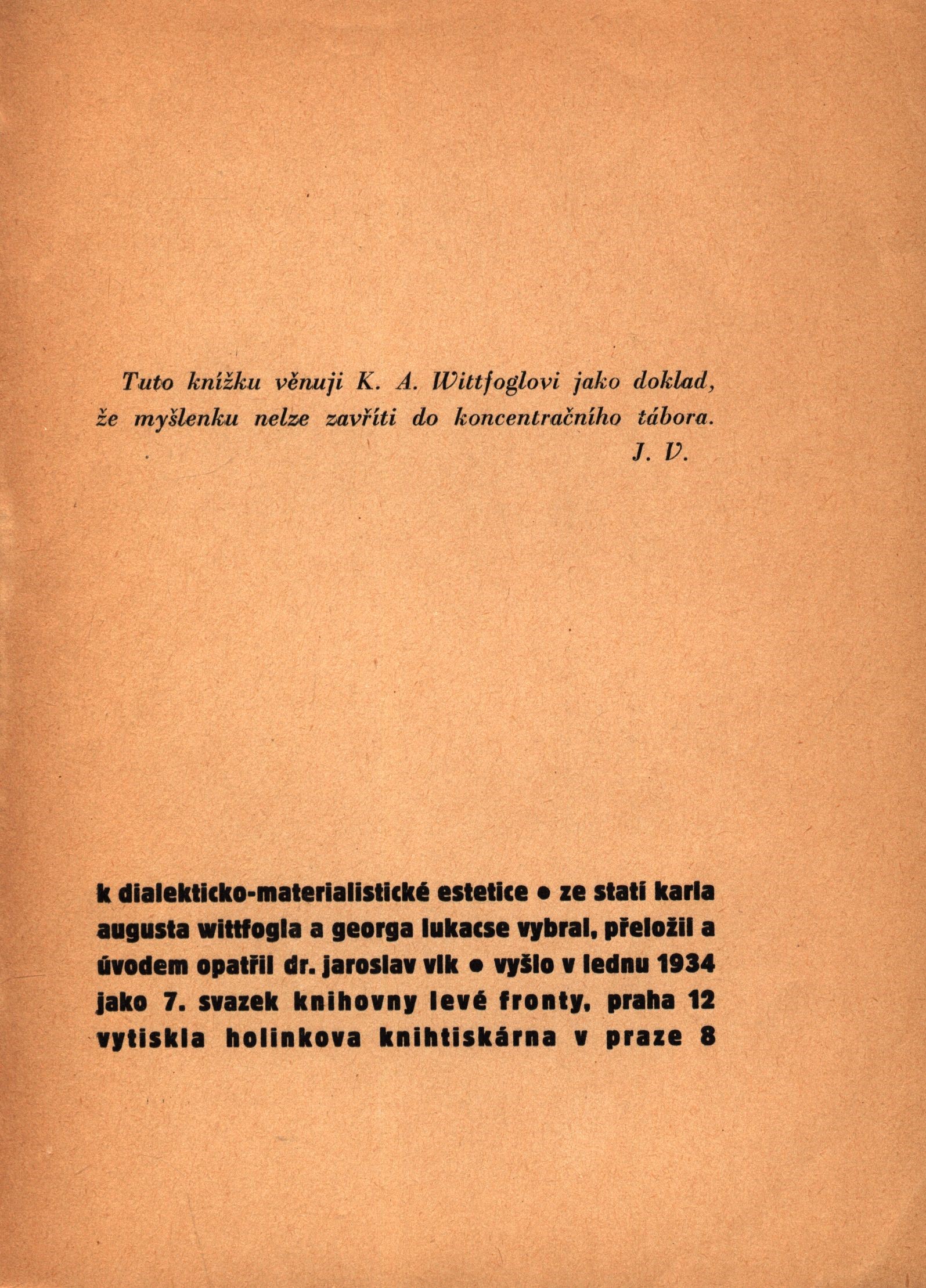 Názvové údaje K marxistické estetice / Wittfogel, Lukacs ; vybral, přeložil a úvodem opatřil Jaroslav Vlk Osobní jméno Wittfogel, Karl August, 1896-1988 (Autor) Další autoři Vlk, Jaroslav (Sestavovatel, kompilátor) (Autor) Lukács, György, 1885-1971 (Autor) Korp. Nakladatelství Levá fronta (Praha) (Nakladatel, vydavatel) Holinkova tiskárna Viktorin a Žatečka (Praha) (Tiskař) Nakladatel V Praze : Holinkova knihtiskárna, 1934 Výrobce V Praze : Levá fronta Rozsah 124 stran ; 19 cm ISBN (brožováno) Edice Knihovna Levé fronty Země vyd. Česko Jazyk dok. čeština Jazyk orig. němčina Poznámky Typograficky řešená obálka. - Předmluva od překladatele. - Obsah. - Tiráž. - Nakladatelská reklama na zadní obálce.