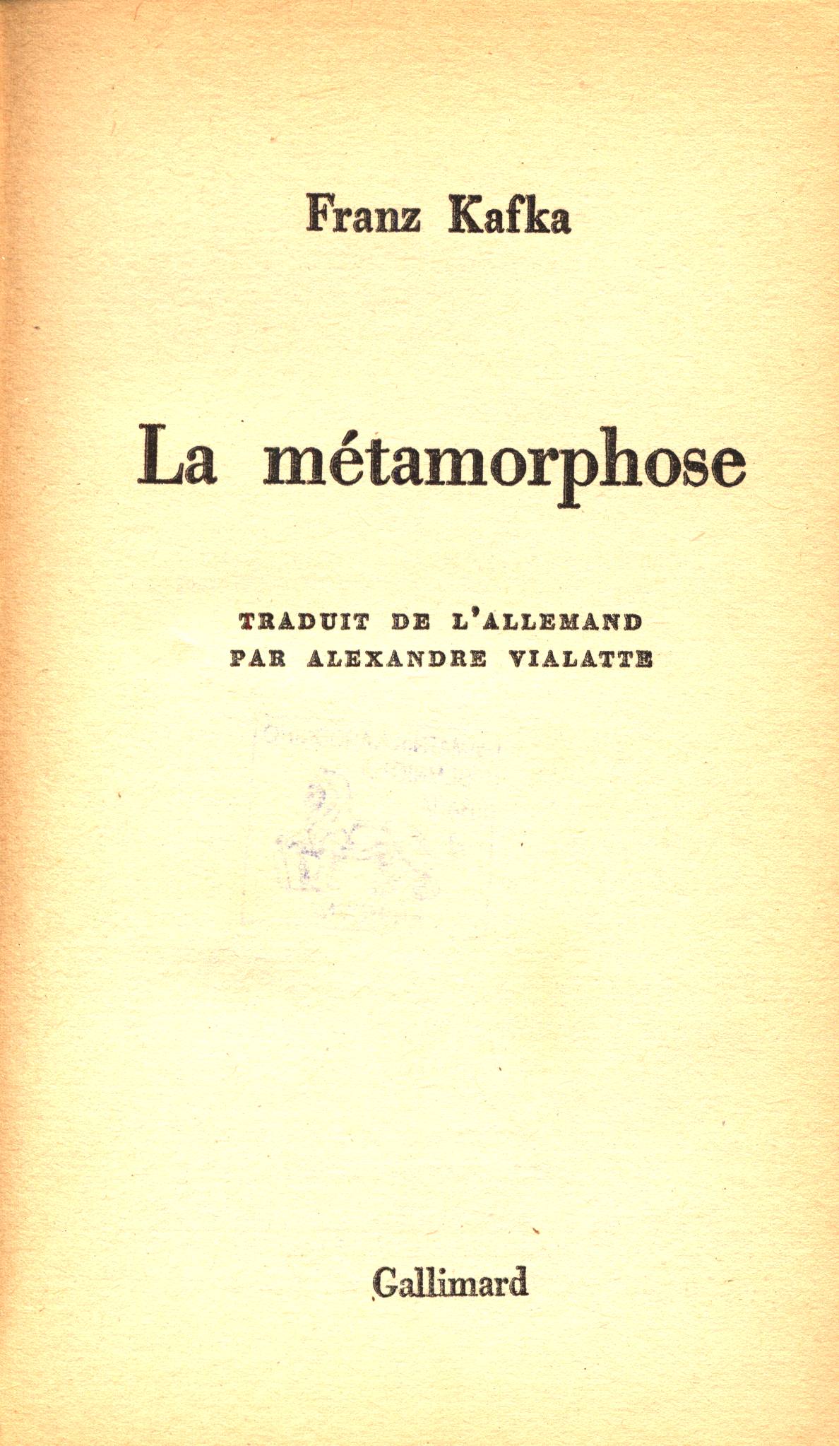 Názvové údaje La métamorphose / Franz Kafka ; traduit de l'allemand par Alexandre Vialatte Osobní jméno Kafka, Franz, 1883-1924 (Autor) Další autoři Vialatte, Alexandre, 1901-1971 (Překladatel) Korp. Gallimard (firma) (Nakladatel, vydavatel) Firmin-Didot (firma) (Tiskař) Nakladatel [Paris] : Gallimard, 1978 Výrobce Paris-Mesnil : Firmin-Didot S.A. Copyright ©1955 Rozsah 189 stran ; 18 cm ISBN (Brožováno) Edice Collection Folio, (Gallimard) 74