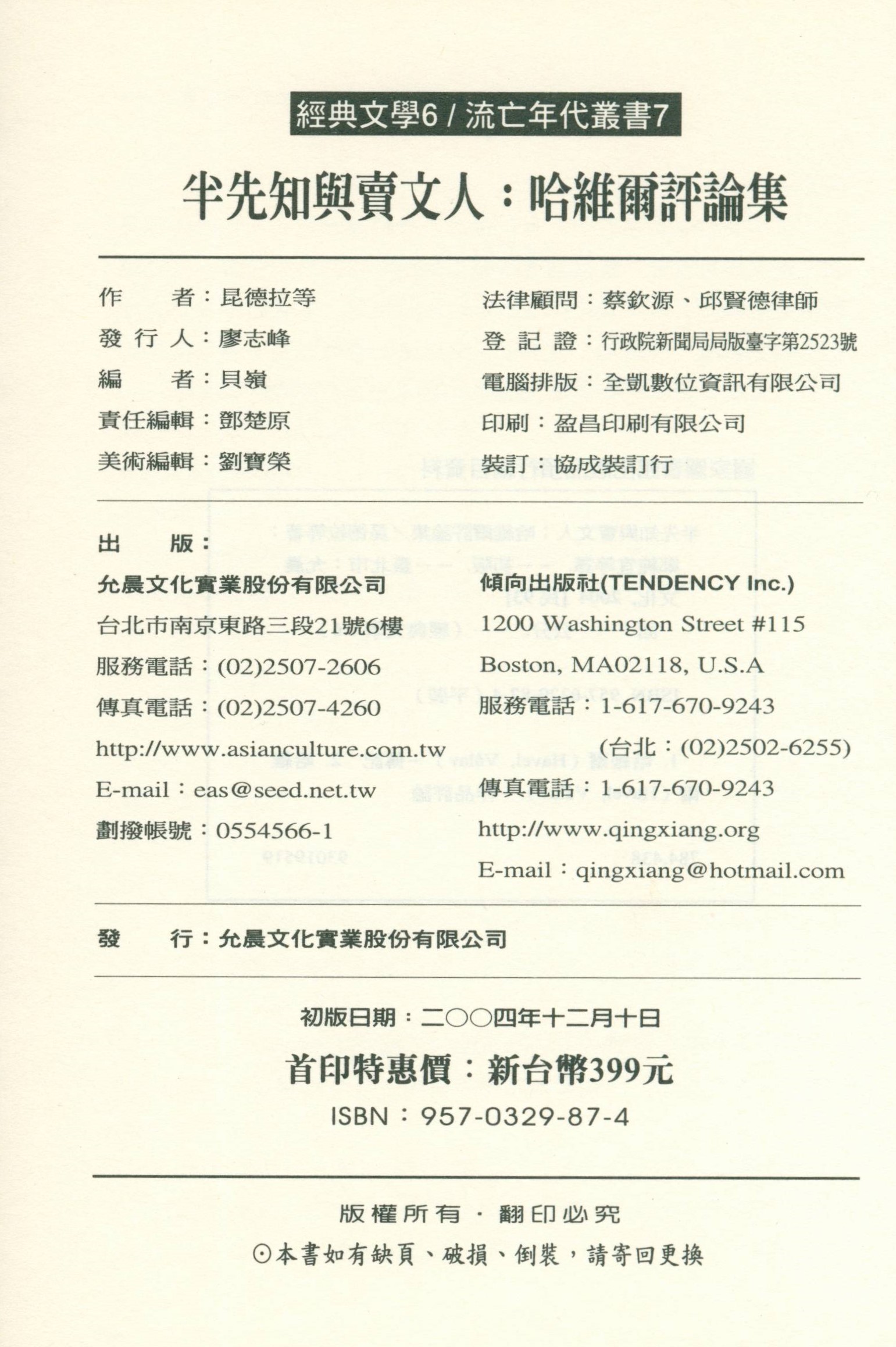 Názvové údaje Poloprorok a literární prodavač - sbírka komentářů k Havlovi / Milan Kundera a ostatní ; upravil Bei Ling Další autoři Kundera, Milan, 1929-2023 (Autor) Bei, Ling, 1959- (Editor) Němec, Tomki, 1963- (Fotograf) Korp. Tendency (nakladatelství) (Nakladatel, vydavatel) Výrobce [Yunchen] : Tendency, 2004 Rozsah 449 stran ; 21 cm ISBN 957-0329-87-4 (brožováno) Země vyd. Česko Jazyk dok. čeština Poznámky Na obálce a vazbě černobílá fotografie V. Havla (T. Němec), dvoubarevný text (i na hřbetu. - Na přední záložce biografie V. Havla v čínštině, na zadní také čínský text. - Černobílá fotografie na titulním listu. - Úvod. - Obsah. - Jednotlivé příspěvky. - Doslov. - Na zadní straně obálky přehled některých autorů. - Přebal.