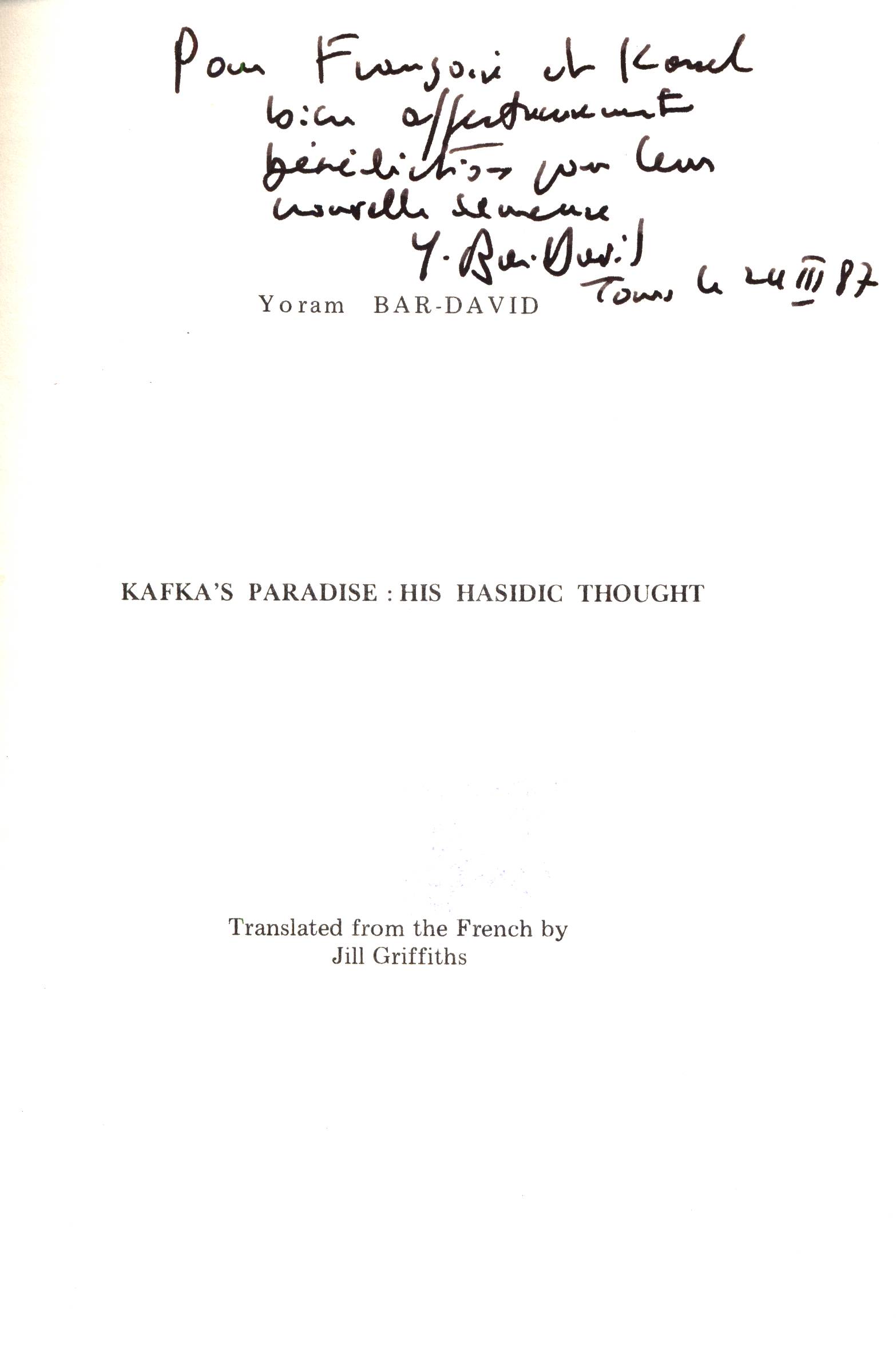 Názvové údaje Kafka's paradise : his hasidic trough / Bar-David, Yoram ; translated from the French by Jill Griffiths Osobní jméno Bar-David, Yoram, 1927- (Autor) Další autoři Griffiths, Jill (Překladatel) Korp. Baltimore Hebrew College (Nakladatel, vydavatel) Gordian Press (Nakladatel, vydavatel) Nakladatel [Baltimore] : Gordian Press ; Baltimore Hebrew College, 1986 Výrobce Tours : Imprimerie de l'Université Rozsah strana 235-286 ; 21 cm ISBN (Brožováno) Země vyd. Spojené státy americké Jazyk dok. angličtina Poznámky Separát z Kafka´s contextuality, edited by Alan Udoff. - Rozmnožená publikace. - Poznámky