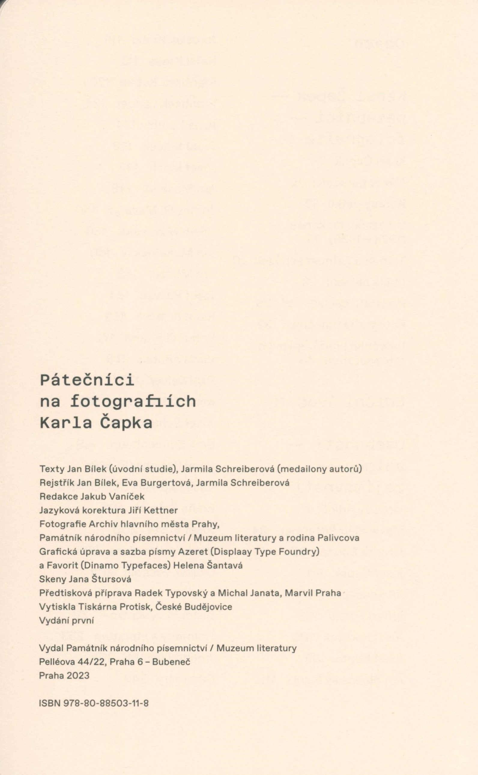 Názvové údaje Pátečníci na fotografiích Karla Čapka / Jan Bílek, Jarmila Schreiberová ; grafická úprava a sazba písmy ... Helena Šantavá Osobní jméno Bílek, Jan, 1972 červenec 6.- (Autor) (Editor) Další autoři Schreiberová, Jarmila, 1949- (Autor) (Editor) Šantavá, Helena, 1978- (Knižní grafik) (Sazeč) Čapek, Karel, 1890-1938 (Fotograf) Korp. Památník národního písemnictví (muzeum literatury) (Nakladatel, vydavatel) Protisk (tiskárna, České Budějovice) (Tiskař) Univerzita Hradec Králové. Pedagogická fakulta (Výzkumník) Údaje o vydání Vydání první Nakladatel Praha : Památník národního písemnictví / Muzeum literatury, 2023 Výrobce České Budějovice : Tiskárna Protisk Rozsah 246 stran : fotografie, 22,5 cm ISBN 978-80-88503-11-8 (brožováno) Země vyd. Česko Jazyk dok. čeština Poznámky Hnědá vazba s černobílou fotografií, barevný text (i na hřbetu). - Patitul. - Úvodní studie. - Černobílé fotografie s popisky. - Část listů v knize barevná. - Ediční úvod. - Medailonky osobností. - Černobílé fotografie, portréty s popisky. - Seznam vyobrazení. - Obsah. - Anotace knihy na zadní straně vazby.
