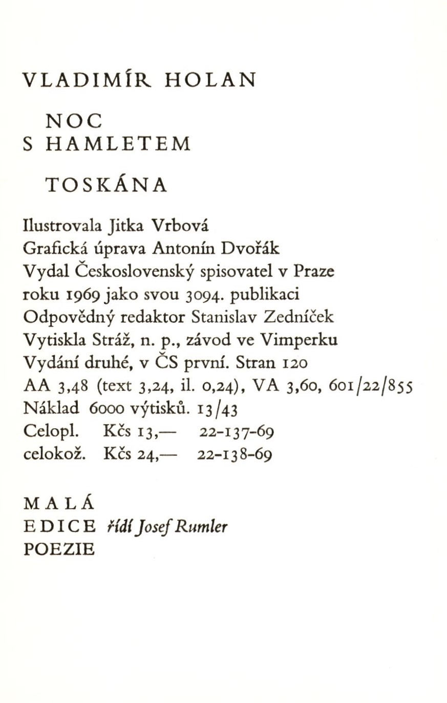 Title information Noc s Hamletem ; Toskána / Vladimír Holan ; ilustrovala Jitka Vrbová Personal name Holan, Vladimír, 1905-1980 (Author) Další autoři Vrbová, Jitka, 1941- (Illustrator) Dvořák, Antonín, 1914- (Graphic technician) Corporation Československý spisovatel (nakladatelství) (Publisher) Stráž, tiskařské závody (Printer) Edition statement Vydání druhé, v ČS první Publication V Praze : Československý spisovatel, 1969 Manufacture Ve Vimperku : Stráž, n. p. Copyright notice date ©1969 Scope 115 stran : ilustrace ; 13 cm ISBN (vázáno) Edition Malá edice poezie