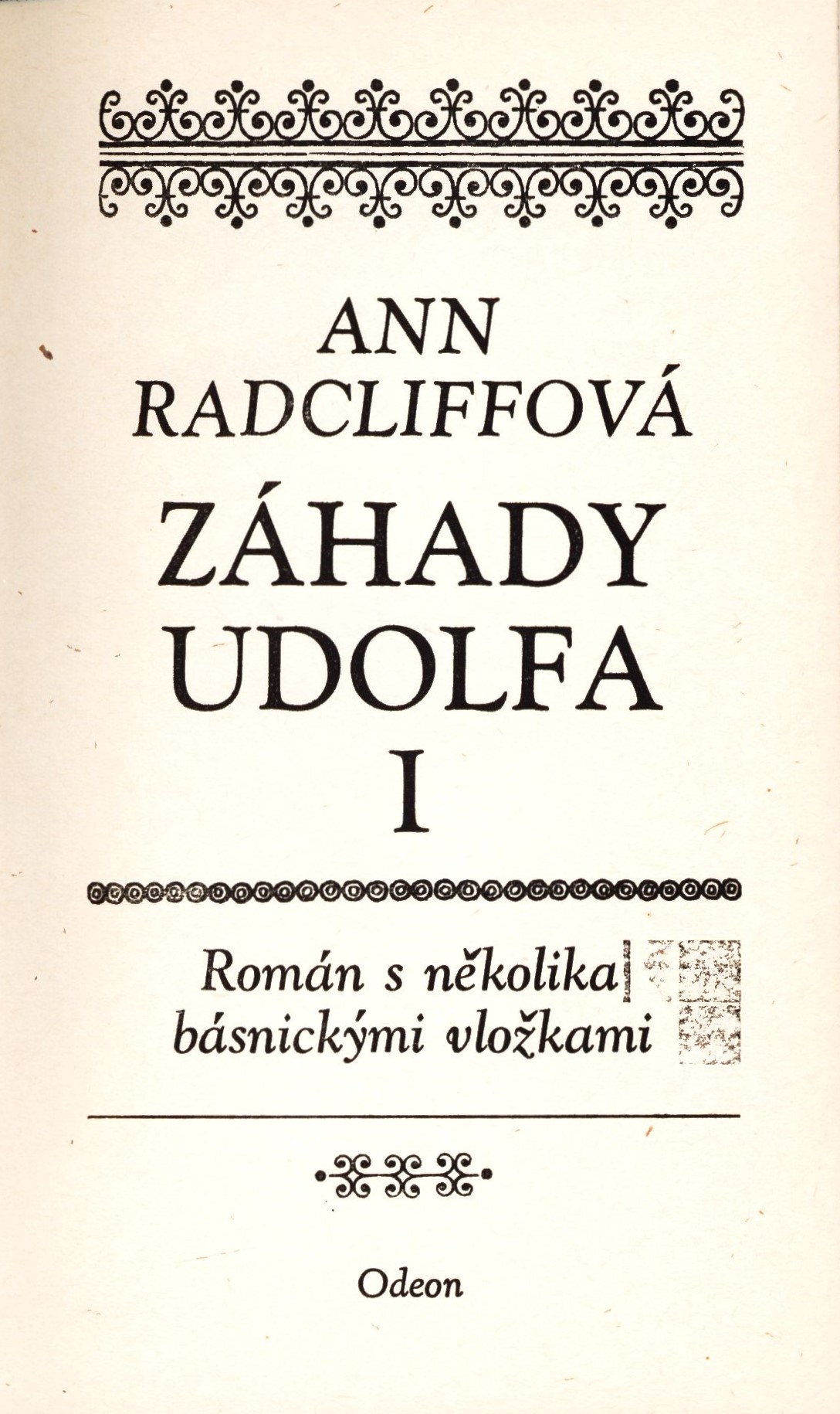 1. Názvové údajeZáhady Udolfa. román s několika básnickými vložkami : Díl I. / Ann Radcliffová ; z anglického originálu přeložili Eliška a Jaroslav Hornátovi