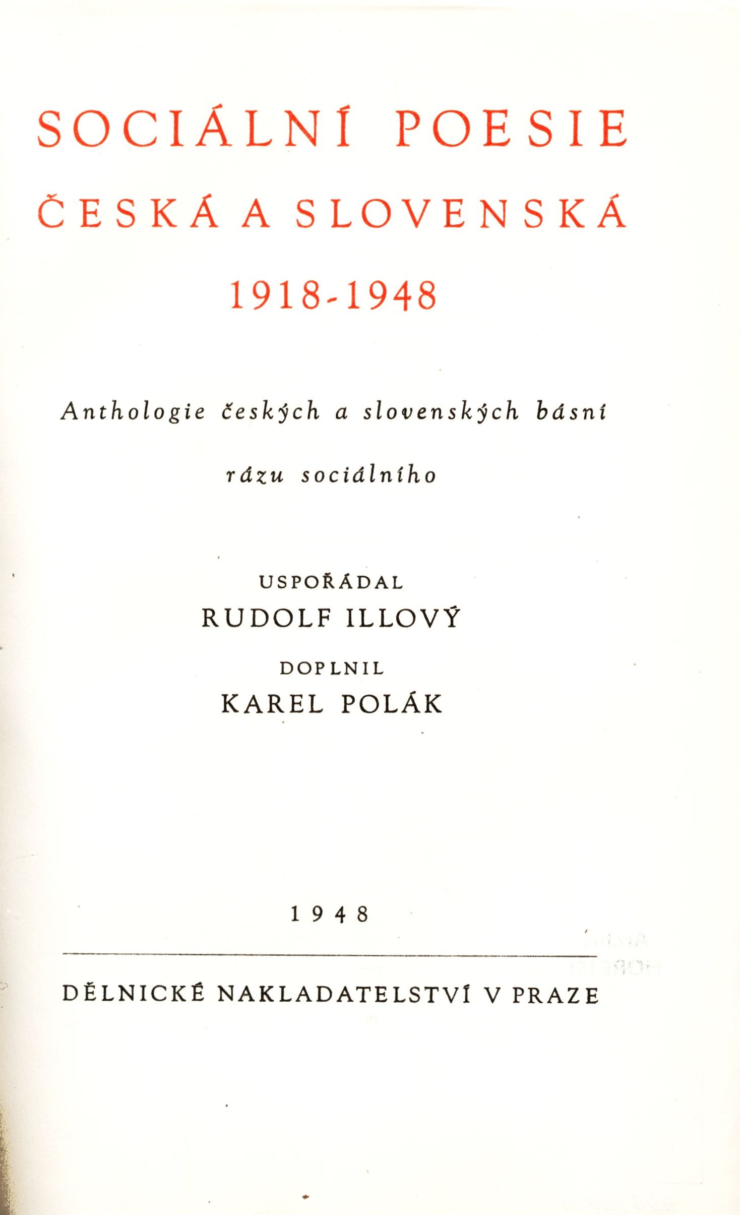 1. Názvové údajeSociální poesie česká a slovenská 1918-1948 : anthologie českých a slovenských básní rázu sociálního / uspořádal Rudolf Illový ; doplnil Karel Polák