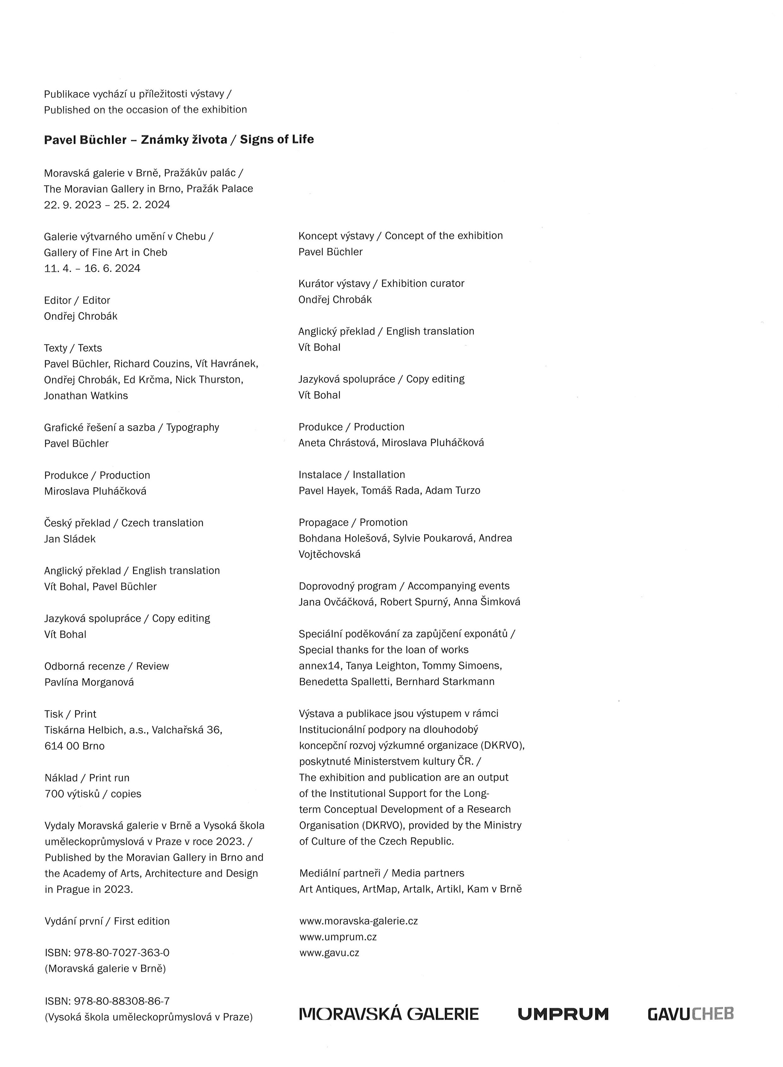 Title information Pavel Büchler : známky života = signs of life / texty Pavel Büchler, Richard Couzins, Vít Havránek, Ondřej Chrobák, Ed Krčma, Nick Thurston, Jonathan Watkins ; český překlad Jan Sládek ; grafické řešení a sazba Pavel Büchler ; anglický překlad Vít Bohal, Pavel Büchler Personal name Büchler, Pavel, 1952- (Artist) (Book designer) (Compositor) (Author) (Translator) Další autoři Couzins, Richard, 1965- (Author) Havránek, Vít, 1971- (Author) Chrobák, Ondřej, 1975- (Author) Krčma, Ed (Author) Thurston, Nick, 1982- (Author) Watkins, Jonathan, 1957- (Author) Sládek, Jan (Translator) Bohal, Vít (Translator) Corporation Moravská galerie (Brno, Česko). Pražákův palác (Organizer of meeting) (Publisher) Galerie výtvarného umění (Cheb, Česko) (Organizer of meeting) (Publisher) Tiskárna Helbich (Printer) Edition statement Vydání první Publication V Brně : Moravská galerie ; v Praze : UMPRUM, 2023 Manufacture Brno : Tiskárna Helbich, a.s. Scope 351 stran : ilustrace (převážně barevné), faksimile ; 30,5 cm ISBN 978-80-7027-363-0 (Moravská galerie ; vázáno) 978-80-88308-86-7 (Vysoká škola uměleckoprůmyslová ; vázáno) Country Czech Republic Language Czech * English Language of the original Czech * English Note Zdobená barevná obálka. - Zdobené předsádky. - Frontispis. - Předmluva. - Barevné, tónované a černobílé fotografie, ilustrace a faksimile. - Obsah. - Biografie Pavla Büchlera. - Seznam prací. - Zdroje přetištěných textů. - Poděkování. - 700 výtisků.