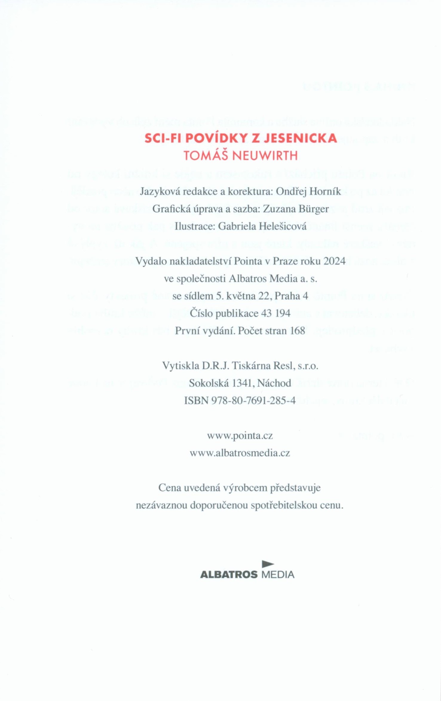 Názvové údaje Sci-fi povídky z Jesenicka / Tomáš Neuwirth ; ilustrovala Gabriela Helešicová ; grafická úprava a sazba: Zuzana Bürger Osobní jméno Neuwirth, Tomáš, 1972- (Autor) Další autoři Helešicová, Gabriela (Ilustrátor) Bürger, Zuzana (Knižní grafik) (Sazeč) Korp. Pointa (nakladatelství) (Nakladatel, vydavatel) Tiskárna Resl (Tiskař) Údaje o vydání První vydání Nakladatel V Praze : Pointa, 2024 Výrobce Náchod : D.R.J. Tiskárna resl, s.r.o. Rozsah 155 stran : barevné ilustrace ; 21 cm ISBN 978-80-7691-285-4 (brožováno) Země vyd. Česko Jazyk dok. čeština Poznámky Obálka s černobílou ilustrací, červený text; červený hřbet s bílým textem. - Červený text na titulním listu. - Poděkování. - Předmluva. - Červený list s bílým textem, černobílá ilustrace (úvod povídek). - Barevné celostránkvé ilustrace. - Drobný černobílý portrét autora a jeho text. - Obsah. - Kniha s Pointou. - Anotace knihy na zadní straně obálky.