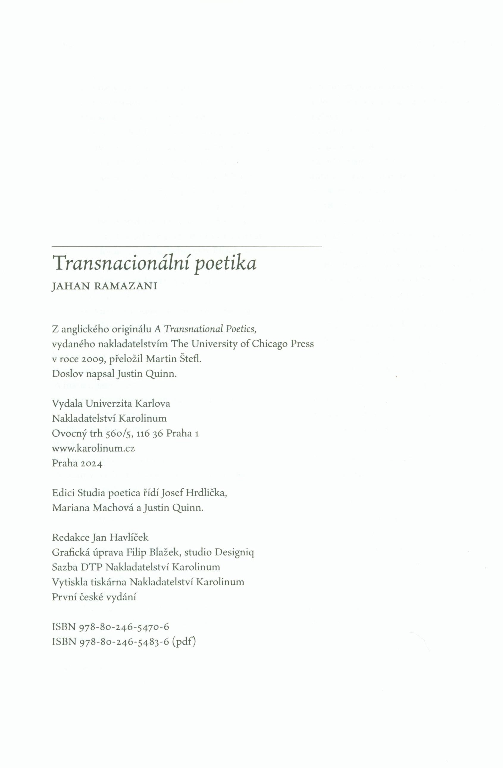 Názvové údaje Transnacionalní poetika / Jahan Ramazani ; přeložil Martin Štefl ; doslov napsal Justin Quinn ; grafická úprava Filip Blažek, studio Designiq Osobní jméno Ramazani, Jahan, 1960- (Autor) Unifikovaný název Transnational poetics. Česky Další autoři Štefl, Martin (Překladatel) Quinn, Justin, 1968- (Autor doslovu, tiráže atd.) Blažek, Filip, 1974- (Knižní grafik) Korp. Nakladatelství Karolinum (Nakladatel, vydavatel) Tiskárna nakladatelství Karolinum (Tiskař) Údaje o vydání První české vydání Nakladatel Praha : Univerzita Karlova, Nakladatelství Karolinum, 2024 Výrobce [Praha] : tiskárna Nakladatelství Karolinum Rozsah 294 stran ; 23 cm ISBN 978-80-246-5470-6 (brožováno) Edice Studia poetica