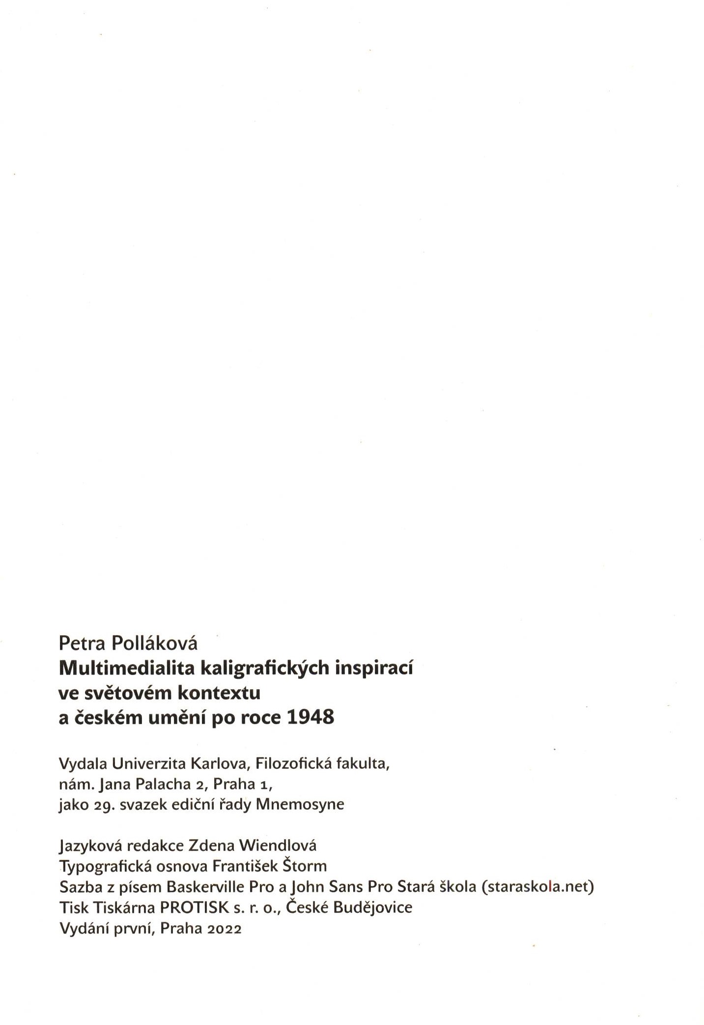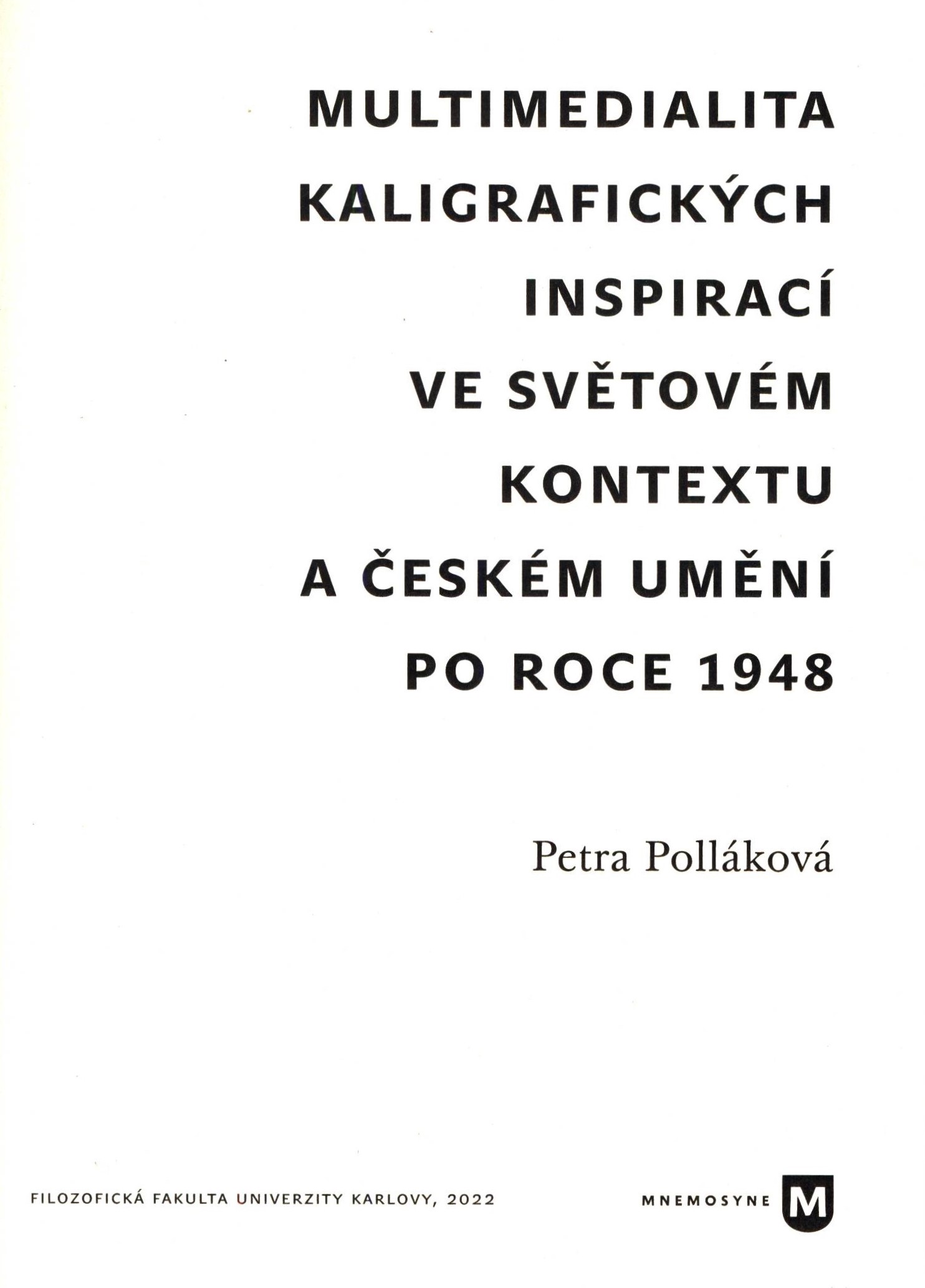 Názvové údaje Multimedialita kaligrafických inspirací ve světovém kontextu a českém umění po roce 1948 / Petra Polláková Osobní jméno Polláková, Petra, 1975- (Autor) Další autoři Univerzita Karlova. Filozofická fakulta (Nakladatel, vydavatel) Protisk (tiskárna, České Budějovice) (Nakladatel, vydavatel) Údaje o vydání Vydání první Nakladatel Praha : Filozofická fakulta Univerzity Karlovy, 2022 Výrobce České Budějovice : Protisk Rozsah 187 stran : barevné ilustrace, faksimile ; 19 cm + 1 záložka ISBN 978-80-7671-073-3 (brožováno) Edice Mnemosyne ; 29. svazek