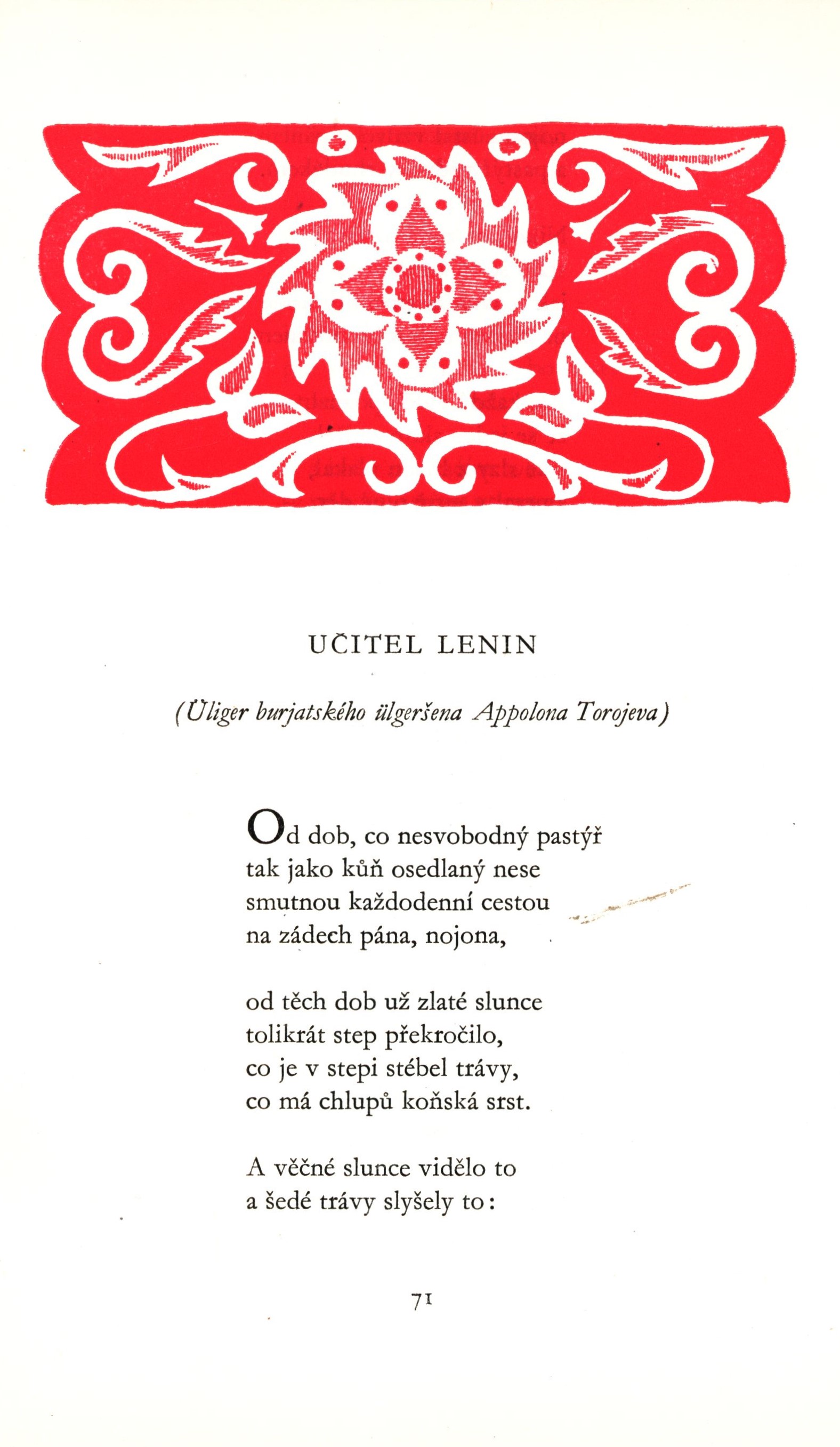 Názvové údaje V.I. Lenin v sovětské lidové poesii / Výbor uspořádal, předmluvu a poznámkami opatřila Eva Vrabcová ; přeložili Radislav Hošek, Vojtěch Jestřáb ... [a j.] Osobní jméno Vrabcová, Eva, 1928- (Sestavovatel, kompilátor) (Autor úvodu atd.) Další autoři Hošek, Radislav, 1922-2005 (Překladatel) Jestřáb, Vojtěch, 1922-2003 (Překladatel) Kundera, Ludvík, 1920-2010 (Překladatel) Marčanová, Marie, 1892-1979 (Překladatel) Milde, Josef, 1900-1968 (Překladatel) Skácel, Jan, 1922-1989 (Překladatel) Valja, Jiří, 1914-1967 (Překladatel) Vladislav, Jan, 1923-2009 (Překladatel) Vrbová, Hana, 1929-1995 (Překladatel) Zavázalová, Vlasta, 1929-2006 (Překladatel) Romberg, Michael Borisovič, 1918-1982 (Ilustrátor) Suková, Vanda, 1927- (Knižní grafik) Korp. Státní nakladatelství krásné literatury, hudby a umění (Nakladatel, vydavatel) Orbis (tiskárna) (Tiskař) Údaje o vydání 1. vydání Nakladatel Praha : Státní nakladatelství krásné literatury, hudby a umění, 1954 Výrobce Orbis 3 Rozsah 213 stran : viněty, ilustrace ; 24 cm ISBN (vázáno) Edice Lidové umění slovesné. Řada A ; svazek první