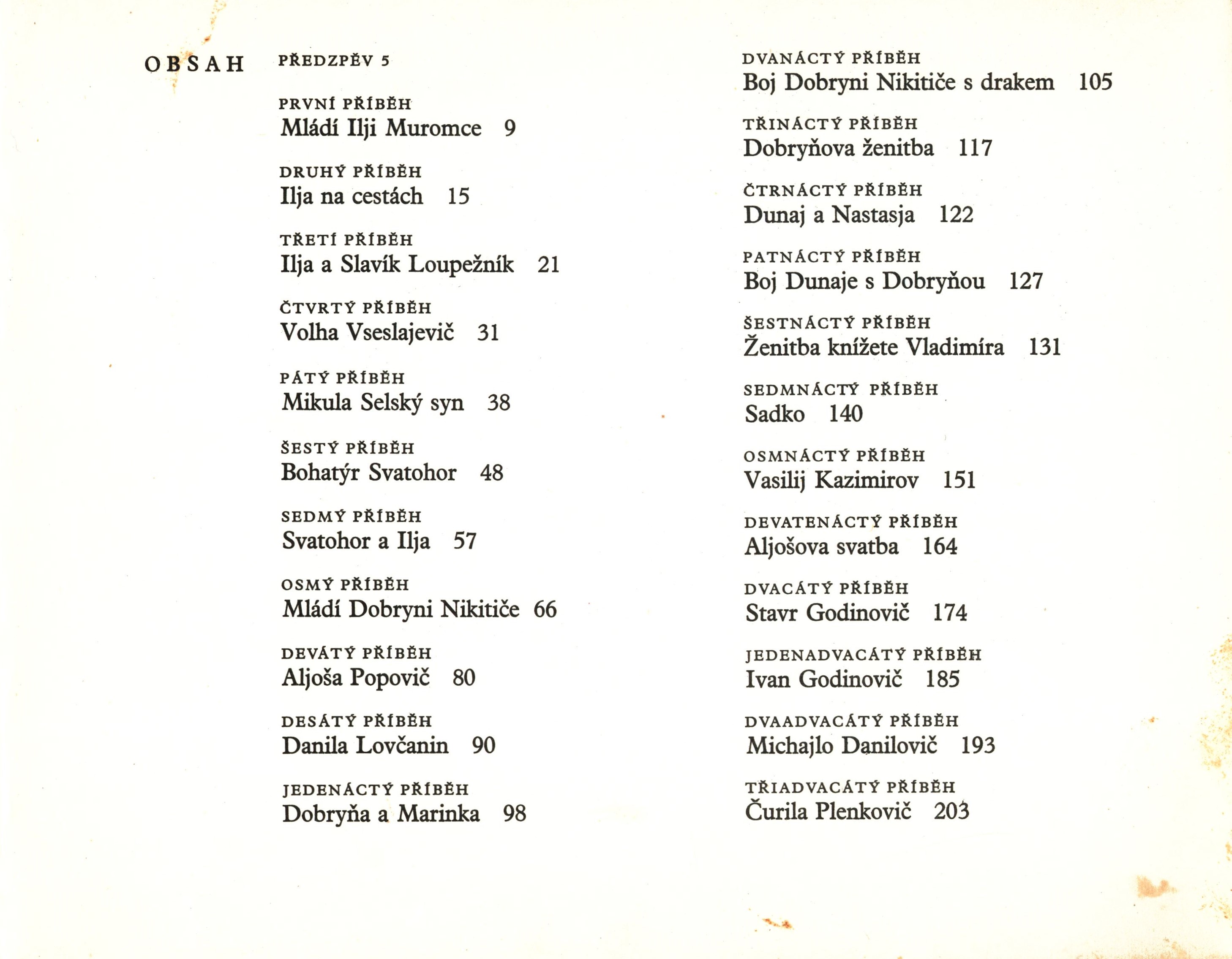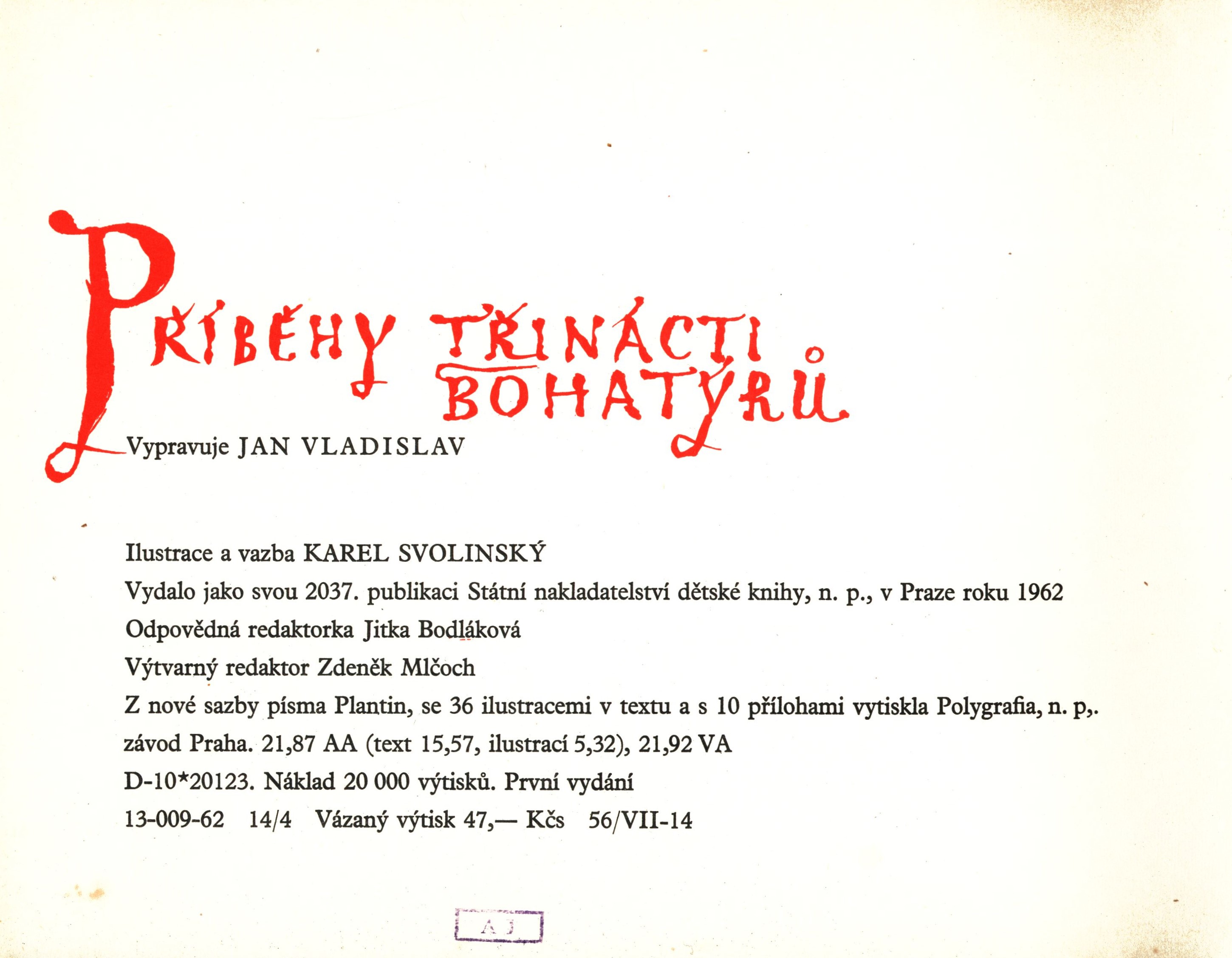 Názvové údaje Příběhy třinácti bohatýrů / Ze staroruských bylin vypravuje Jan Vladislav ; ilustrace a vazba Karel Svolinský Osobní jméno Vladislav, Jan, 1923-2009 (Autor) Další autoři Svolinský, Karel, 1896-1986 (Ilustrátor) (Výtvarník vazby) Korp. Státní nakladatelství dětské knihy (Nakladatel, vydavatel) Polygrafia (tiskárna, Praha) (Tiskař) Údaje o vydání První vydání Nakladatel Praha : Státní nakladatelství dětské knihy, 1962 Výrobce Polygrafia, n. p. Rozsah 314 stran, [10] stran obrazových příloh : ilustrace, iniciály ; 20 cm ISBN (vázáno) Země vyd. Česko Jazyk dok. čeština Jazyk orig. ruština Poznámky Plátěná vazba s oranžovou ražbou. - Ilustrované předsádky. - Typografický, barevný dvojlist titulního listu. - Zdobené počáteční iniciály. - Barevné ilustrace na složených dvojlistech. - Literatura. - Obsah. - Tiráž.