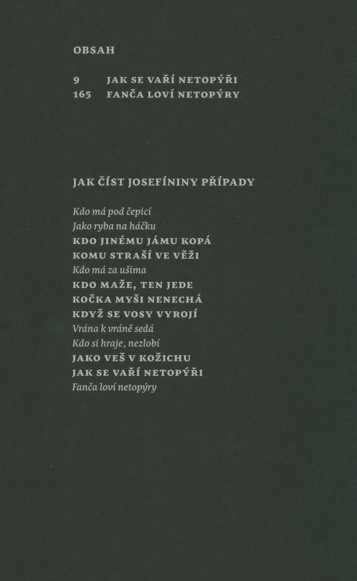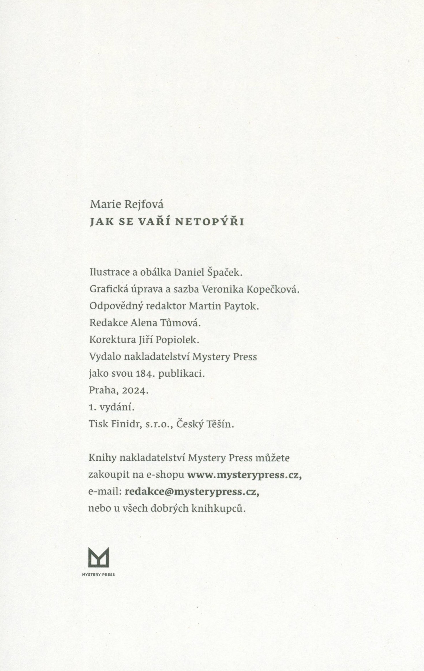 Názvové údaje Jak se vaří netopýři / Marie Rejfová ; ilustrace a obálka Daniel Špaček ; grafická úprava a sazba Veronika Kopečková Osobní jméno Rejfová, Marie, 1976- (Autor) Další autoři Špaček, Daniel, 1977- (Ilustrátor) (Autor obálky) Kopečková, Veronika, 1977- (Knižní grafik) (Sazeč) Korp. Mystery Press (nakladatelství) (Nakladatel, vydavatel) Finidr (tiskárna) (Tiskař) Údaje o vydání 1. vydání Nakladatel Praha : Mystery Press, 2024 Výrobce Český Těšín : Finidr, s.r.o. Rozsah 218 stran ; 21 cm ISBN 978-80-7588-601-9 (vázáno) Země vyd. Česko Jazyk dok. čeština Poznámky Světlá obálka s barevnou ilustrací, dvoubarevný text (i na hřbetu). - Na přední záložce biografie hlavní hrdinky a její kreslený portrét, na zadní kreslený portrét a stručná biografie autorky. - Fialová vazba, černofialová ilustrace, černý text (i na hřbetu). - Černé zdobené předsádky. - Patitul. - Rozložený titulní list. - Přehled autorčiných knih. - Kapitoly (v úvodu černý list s bílou ilustrací). - Obsah. - Jak číst Josefíniny případy. - Upoutávka na autorčin blog. - Anotace knihy na zadní straně ilustrované obálky. - Přebal.