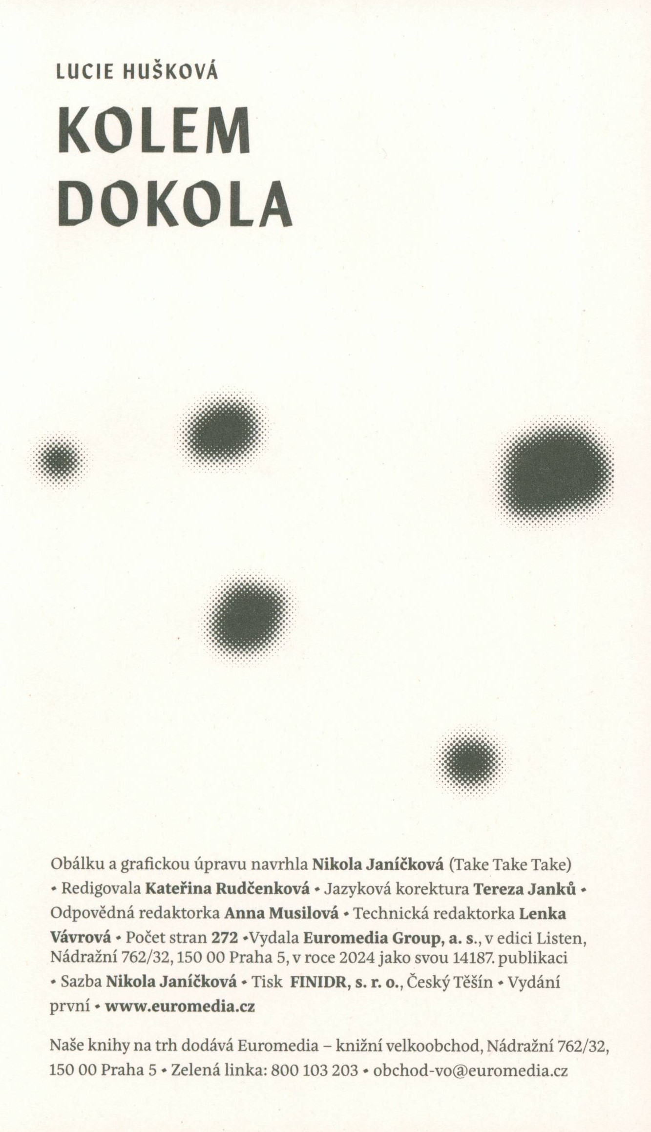 Názvové údaje Kolem dokola / Lucie Hušková ; obálku a grafickou úpravu navrhla Nikola Janíčková Osobní jméno Hušková, Lucie, 1987- (Autor) Další autoři Janíčková, Nikola, 1990- (Autor obálky) (Knižní grafik) Korp. Euromedia Group, a. s. - Listen (nakladatelství) (Nakladatel, vydavatel) Finidr (tiskárna) (Tiskař) Údaje o vydání Vydání první Nakladatel Praha : Euromedia Group, 2024 Výrobce Český Těšín : FINIDR, s.r.o. Rozsah 269 stran ; 21 cm ISBN 978-80-242-9757-6 (vázáno) Země vyd. Česko Jazyk dok. čeština Poznámky Černá vazba s barevnou ilustrací, barevně zdobená, bílý text (i na hřbetu). - Žluté předsádky. - Patitul. - Černobílá ilustrace na titulním listu. - Dva příběhy. - Anotace knihy a stručná biograie autorky na zadní straně vazby.