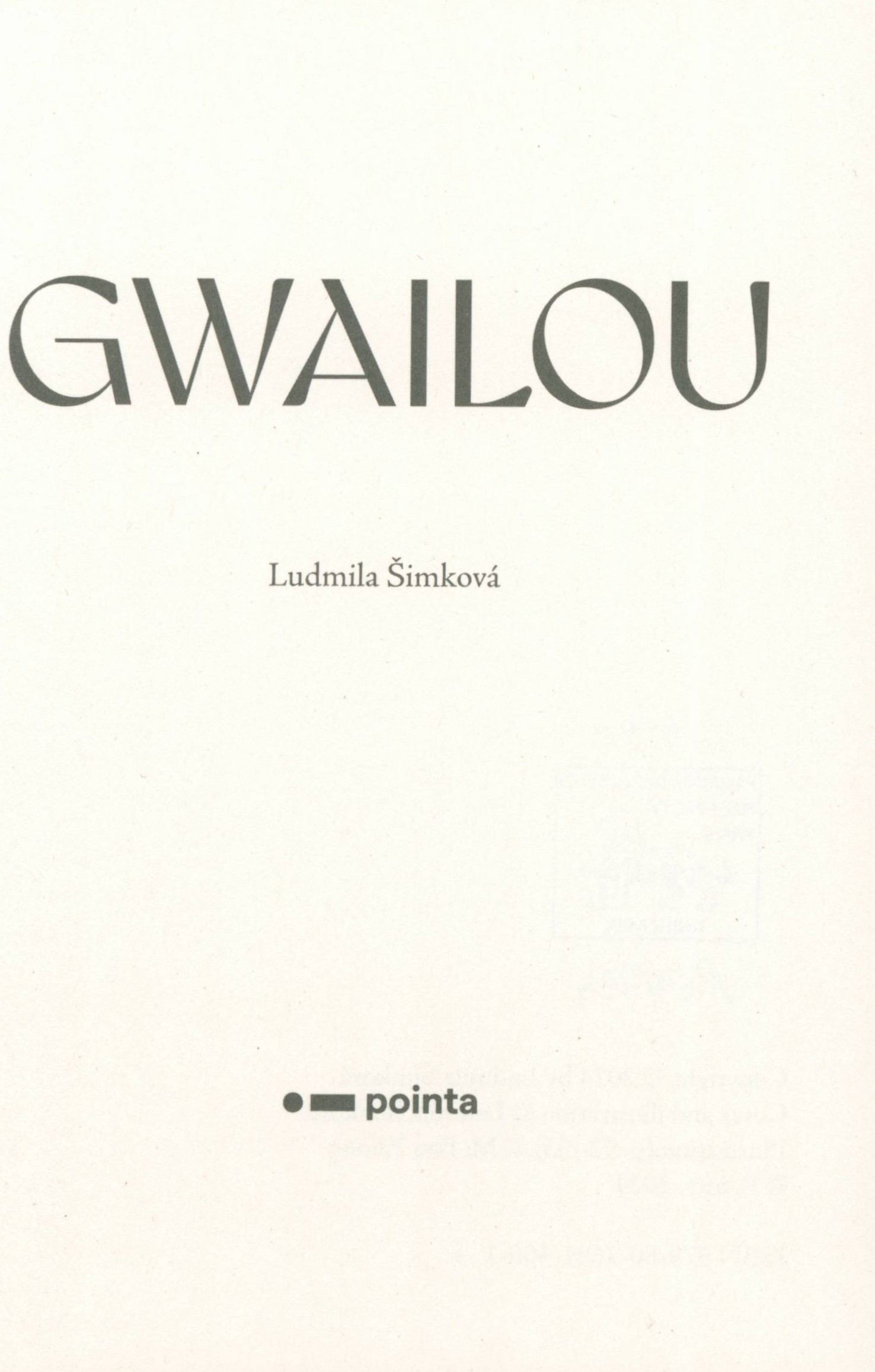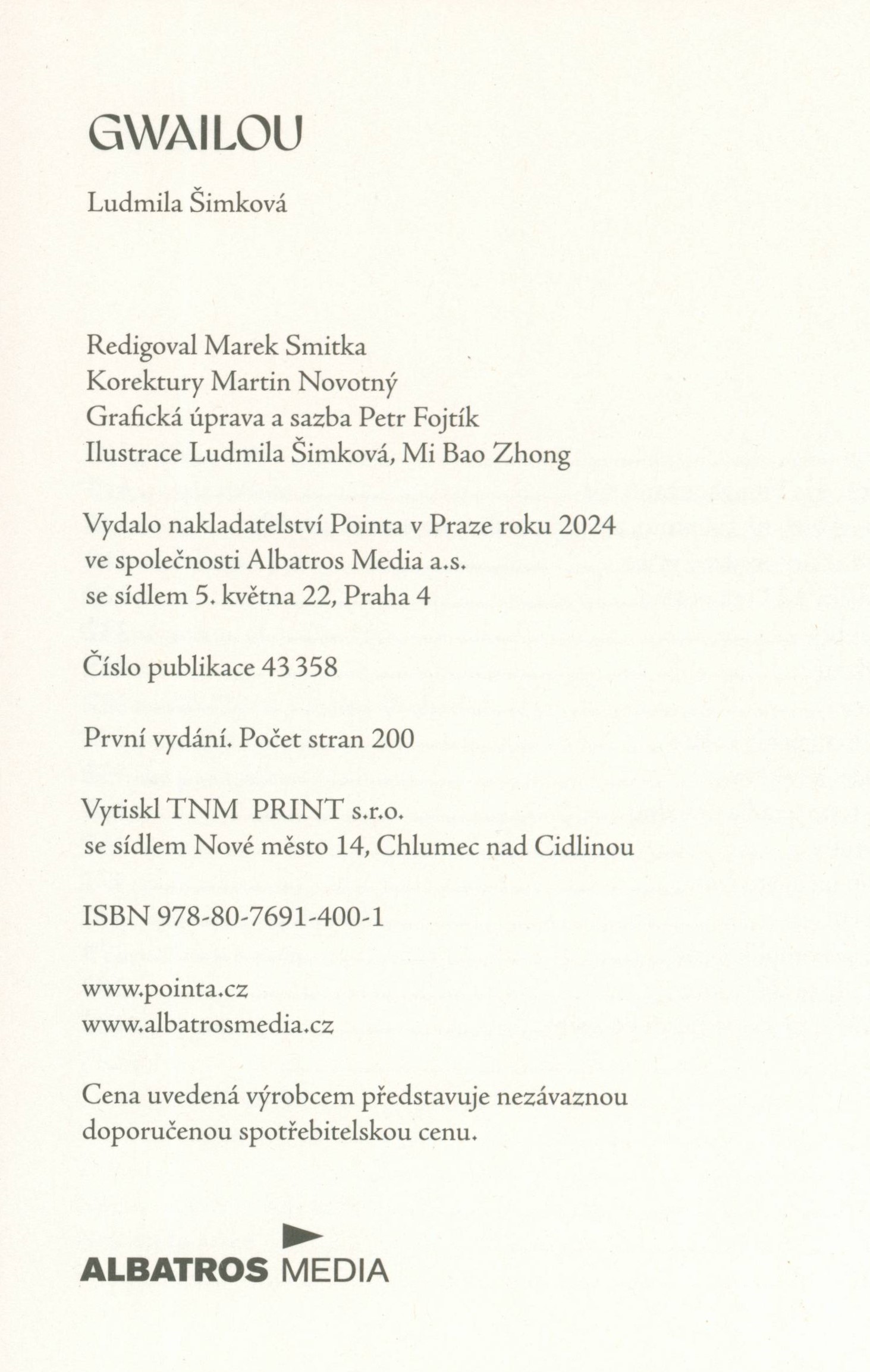 Názvové údaje Gwailou / Ludmila Šimková ; obálka a ilustrace Ludmila Šimková Osobní jméno Šimková, Ludmila (Autor) Další autoři Pointa (nakladatelství) (Nakladatel, vydavatel) TNM PRINT s. r. o. (tiskárna) (Tiskař) Údaje o vydání První vydání Nakladatel V Praze : Pointa, 2024 Výrobce Chlumec nad Cidlinou : TNM Print s.r.o. Rozsah 191 stran : ilustrace ; 22 cm ISBN 978-80-7691-400-1 (vázáno) Země vyd. Česko Jazyk dok. čeština Poznámky Bílá vazba s černobílou ilustrací, dvoubarevný text (i na hřbetu). - Patitul. - Celostránkové tuší malované ilustrace. - Kniha s Pointou. - Obsah. - Anotace knihy a recenze na zadní straně vazby.