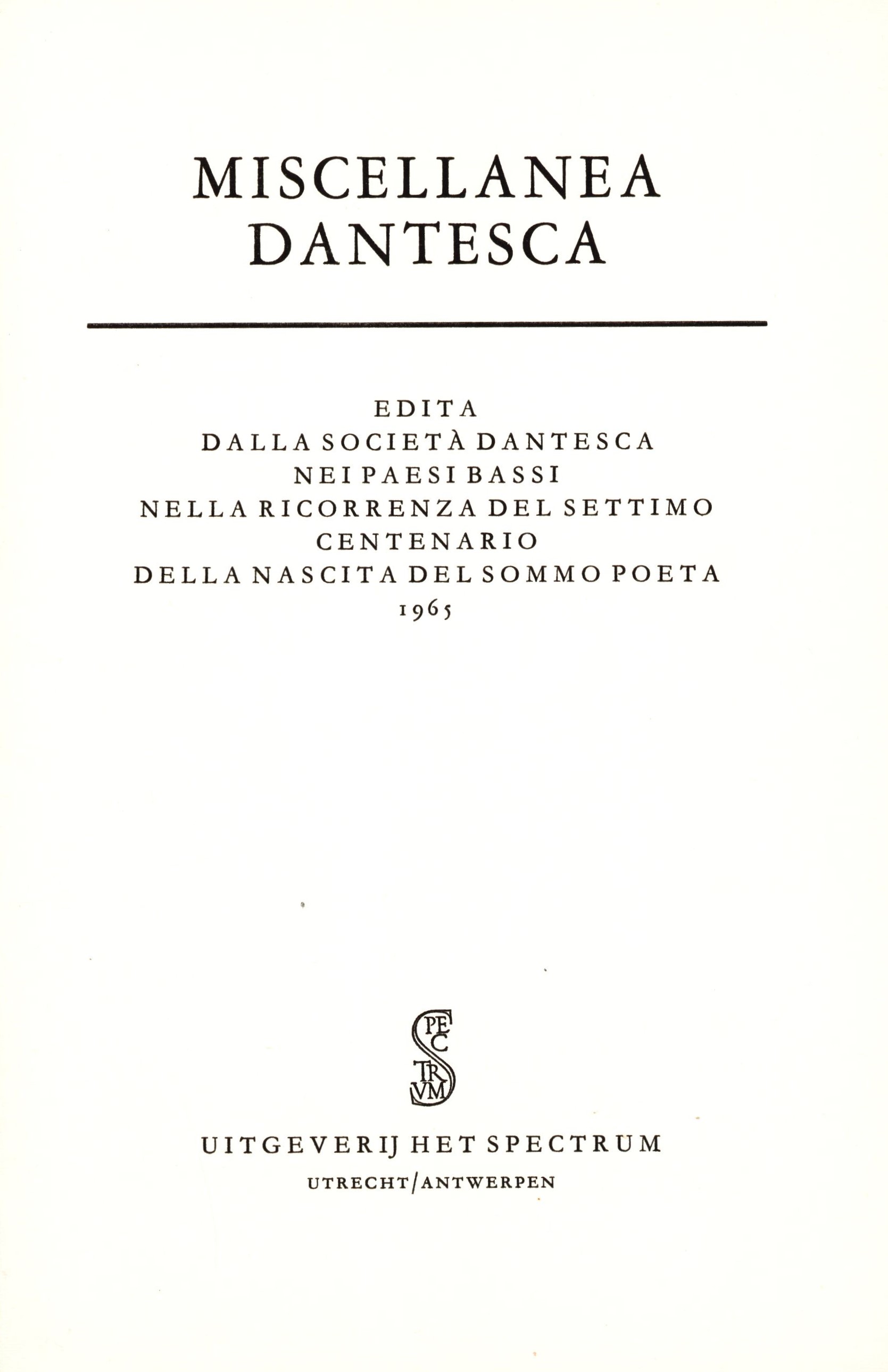Názvové údaje Miscellanea Dantesca / Edita dalla Società dantesca nei paesi bassi nella ricorrenza del settimo centenario della nascita del sommo poeta Záhlaví-korpor. Società dantesca italiana (Nakladatel, vydavatel) Další autoři Uitgeverij Het Spectrum (Nakladatel, vydavatel) Nakladatel Utrecht/Antwerpen : Uitgeverij Het Spectrum, 1965 Rozsah 284 stran ; 23 cm ISBN (vázáno) Země vyd. Nizozemsko Jazyk dok. italština Poznámky Zdobený přebal. - Černobílý titulní list. - Obsah.