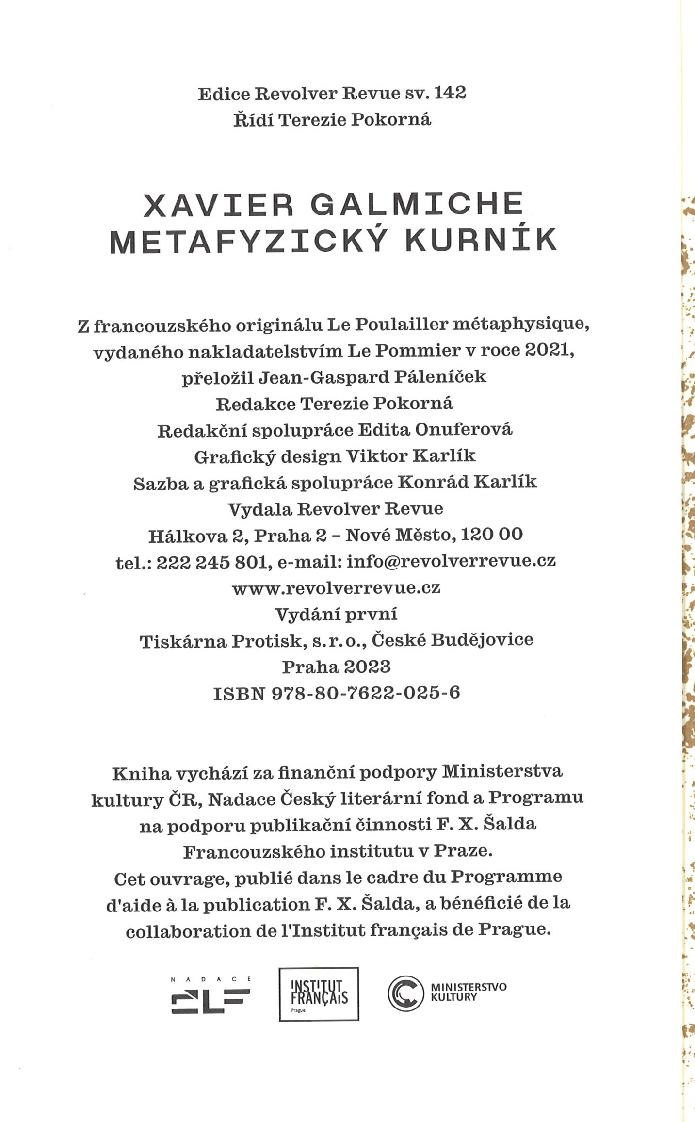 Edice Revolver Revue, (Revolver Revue)Země vyd. Česko Jazyk dok. čeština Jazyk orig. francouzština Poznámky Zdobená obálka. - Poznámka překladatele. - Medailon autora. - Na zadní straně obálky volná záložka s chlopněmi, obsahuje úryvky recenzí.